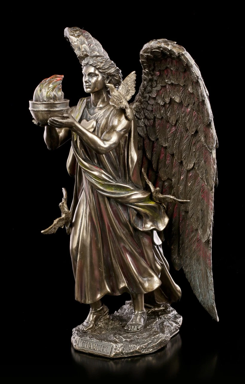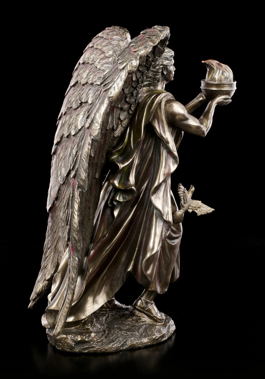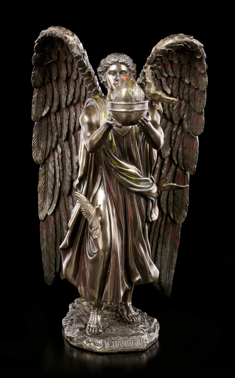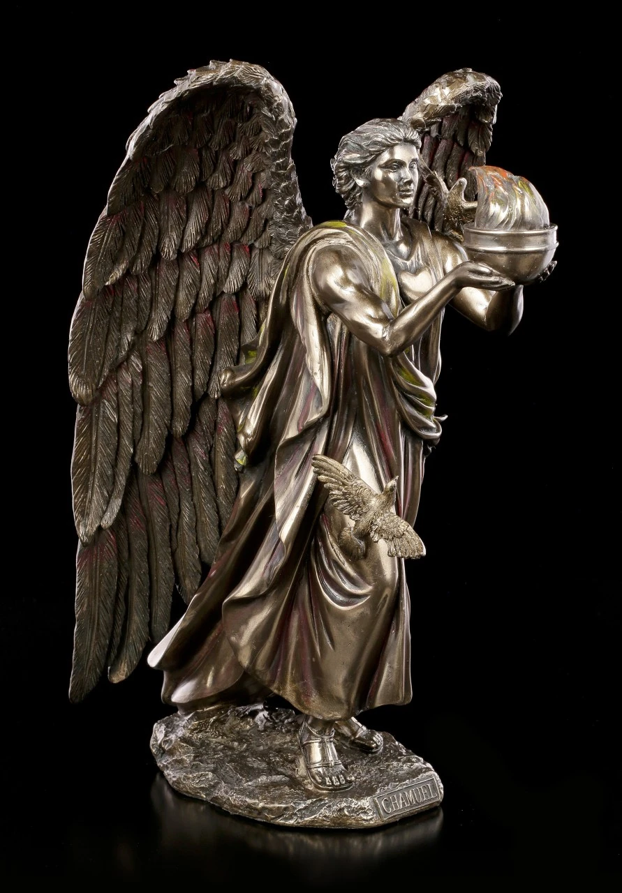Aus der Divinity Collection stammt diese bronzierte und colorierte Erzengel Figur. Sie stellt Chamuel dar – „Er, der Gott sieht“. Chamuel ist der Gottesbote, der Hüter der Innigkeit und Herzenswärme. Als Engel der Nächstenliebe nimmt er einen hohen Rang in der Engelhierarchie ein.