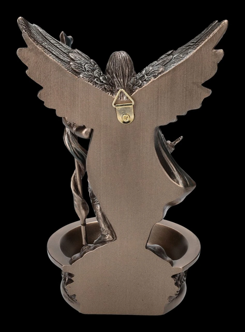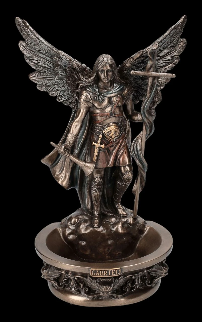 Aus der Studio Collection von Veronese stammt dieses ungewöhnliche Weihwasserbecken mit dem Erzengel Gabriel als schöner Jüngling.mit langem Haar und bekleidet mit einem Lendenschurz und Gürtel, an dem ein Dolch hängt sowie Stiefeln und wehendem Umhang. Der Erzengel Gabriel ist als wichtiger Bote und Mittelsmann zwischen Himmel und Erde bekannt und hat in der einen Hand einen Wanderstab und in der anderen ein Horn. Wegen seiner kommunikativen Fähigkeiten wurde er u.a. zum Schutzengel der Boten und Kuriere und allen, die mit Post- und Fernmeldediensten zu tun haben. Das 18,5 cm hohe, 12 cm breite und 8 cm tiefe Weihwasserbecken mit dem Erzengel Gabriel wurde bis zu dem verzierten Becken und den großen Flügeln sehr detailreich aus edel bronziertem und coloriertem Kunststein (Polyresin) gefertigt. Es kann auf den Tisch oder einen Altar gestellt, aber auch an die Wand gehängt werden und ist auch ein prächtiges Geschenk für jeden, der den Erzengel Gabriel als Schutzeengel verehrt.