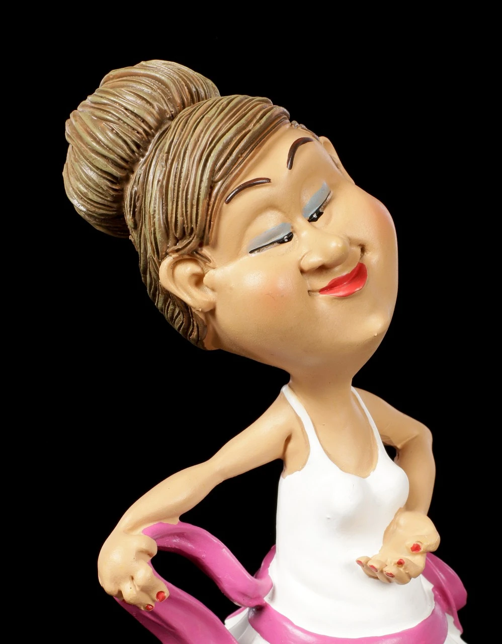 Die Ballett Tänzenerin übt mit sicheren und anmutigen Bewegungen immr wieder Ballettschritte aus Schwanensee. Als Maskottchen hat sie daher stets ihren weißen Schwan dabei. Das weiße Ballettkostüm erinnert selbst an einen eleganten Schwan. Die lustige Funny Job Figur aus Kunststein (Polyresin) ist im berühmten Karikatur Stil gehalten und liebevoll handbemalt.