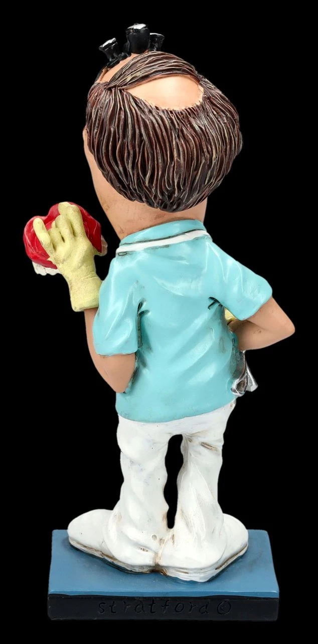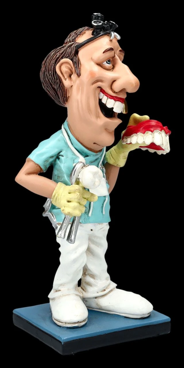 Zumindest werden die Patienten bei der Behandlung sofort lachen müssen, wenn sie in der Praxis diesen lustigen Zahnarzt entdecken. Die witzige Funny Job Figur von Warren Stratford ist sehr detailreich aus handbemaltem Kunststein (Polyresin) gefertigt. Den fröhlichen Zahnarzt mit der Höhe von 17 cm, der Breite:von 8 cm und der Tiefe von 6,5 cm sollten Sie in Ihrer Praxis also sichtbar aufstellen. Er ist aber auch ein tolles Geschenk für Ihren Zahnarzt, wenn Sie mit der Behandlung so richtig zufrieden sind.