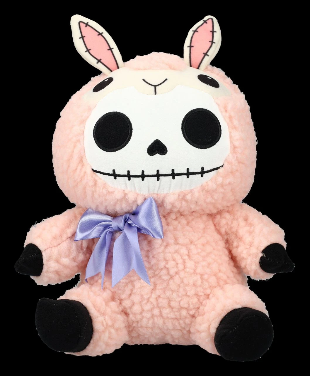 Ein rosa Alpaka mit blauer Schleife als Kuscheltier, wie toll ist das denn. Aber in dem Fall nur für Erwachsene – schließlich schaut ein Furrybone-Skelettchen aus dem plüschigen Fell hervor. Aber auch Erwachsene freuen sich, wenn sie das als rosa Alpaka verkleidete putzige Furrybone-Skelettchen Paco als Geschenk überreicht bekommen. Schließlich wurde er aus kuschelig weichem 100 % Polyester gefertigt. Für Babies und Kleinkinder ist Paco trotzdem nicht geeignet. Aber schließlich lieben nicht nur Kinder Kuscheltiere. Auch alle Gothic- und Halloween- und Manga–Fans werden sich darüber freuen, wenn sie das 26 cm hohe, 21 cm breite und 14 cm tiefe plüschige Totenkopf-Figürchen Paco entdecken. Sammler finden übrigens eine große Auswahl an weiteren niedlichen Furrybone-Figuren in unserem Shop