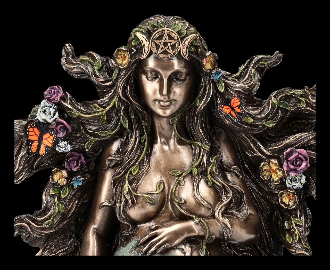 Glücklich lächelnd sitzt Gaia, die in der altgriechischen Mythologie als Mutter Erde verehrt wurde, auf dem Boden. Mit ihren Händen streichelt sie zärtlich ihren schwangeren Bauch, den man sofort als Erde erkennen kann. Grüne Ranken winden sich um den Körper der bezaubernden Gaia-Figur und in ihrem in langen Wellen fallenden Haar sammeln sich Blüten und Schmetterlinge. Die Urgöttin Gaia wird als Göttin der Natur die vielfältigen Arten der Pflanzen und Tiere nach der Geburt auf der Erde verteilen, damit sie Menschen Freude und Hoffnung geben. Diese wunderschöne Gaia-Figur aus der Studio Collection von Verones wurde detailreich aus edel bronziertem und sehr fein coloriertem Kunststein (Polyresin) gefertigt. Die 17,5 cm hohe, 16,5 cm breite und 8,5 cm tiefe Gaia-Figur demonstriert in dieser herrlichen Darstellung perfekt Leben, Körperlichkeit, Fruchtbarkeit und Mütterlichkeit und ist damit ein wunderbares Geschenk für alle, die die Natur lieben und im Sinne der Mutter Erde schützen möchten.