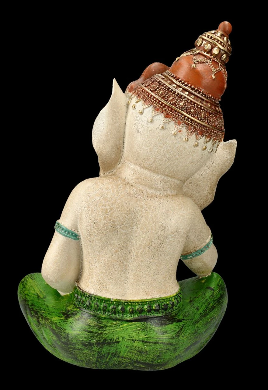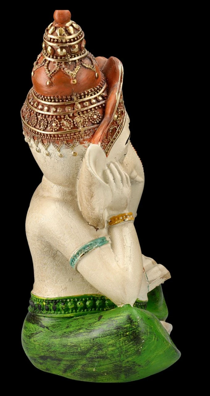 Ganesha, der im Hinduismus aber auch im Buddhismus so beliebte und verehrte Gott mit dem Elefantenkopf wird in vielen Lebenslagen angerufen. Also ist es nicht verwunderlich, wenn auch er einmal eine spirituelle Ruhepause einlegt und beim Lesen etwas vor sich hindöst. Schließlich wird Ganesha als Gott der Weisheit und der Wissenschaften, aber auch der Künste verehrt und bei diesen vielen Aufgaben muss sich auch der stärkste Gott mal entspannen. Die liebevoll handbemalte Ganesha-Figur aus Kunststein (Polyresin) ist 31 cm hoch, 21,5 cm breit und 15 cm tief und ein wunderbarer und durchaus spaßiger und sehr netter Blickfang. Der beliebte Gott Ganesha gilt aber auch als Glücksbringer und ist daher ein perfektes Geschenk. In unserem Shop gibt es übrigens noch weitere wunderbar handbemalte Ganesha-Figuren für jede Lebenslage.