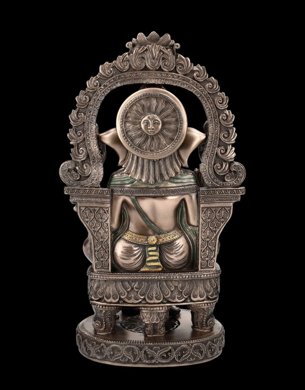 Wie ein Tempelbogen wirkt die Rücklehne des Throns, auf dem der beliebte Gott Ganesha sitzt. Jeder kennt sicher das Bild des Gottes mit dem Menschenkörper und dem Elefantenkopf, der mittlerweile nicht nur in asiatischen Ländern sehr beliebt ist. Ganesha steht für die beste Anfangsenergie und einen guten Beginn, für die Überwindung von Hindernissen, eine praktische und leicht zugängliche Weisheit und schließlich auch für das Genießen der süßen Seiten des Lebens. Seine vier Arme sollen Geist, Intellekt, Ego und Bewusstsein.repräsentieren. Zum Beispiel hält er ein Seil in der Hand, mit dem er den Gläubigen, den er aus seinen weltlichen Problemen hilft und mit ewiger Glückseligkeit verbindet. Diese wunderbare Skulptur des Gottes der Weisheit, der Wissenschaften und der Künste stammt aus der Studio Collection von Veronese. Die 26 cm hohe, 15 cm breite und 9,5 cm tiefe Ganesha Figur unter dem Tempelbogen wurde sorgfältig und detailreich aus edel bronziertem und schön coloriertem Kunststein (Polyresin) gefertigt. Sie bringt ein festliches und asiatisches Feeling in jedes Ambiente und ist als Glücksbringer auch ein wunderbares Geschenk zum Beispiel für jeden, dem man einen guten Start bei einem Vorhaben wünscht.