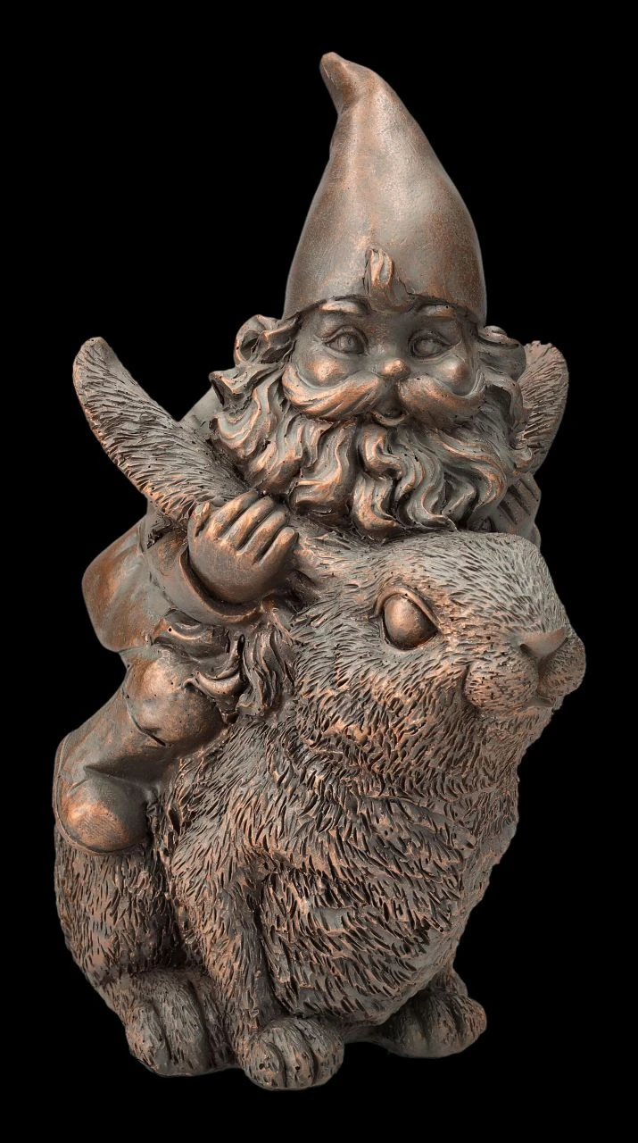 Da hat sich der Gartenzwerg aber ein tolles Reittier aus seinem Stall ausgewählt. Allerdings scheint der Hase nicht unbedingt bereit für einen Ausritt zu sein… Mal nicht in bunt, sondern eher edel zurückhaltend wurde der auf einem Hasen reitende Gartenzwerg aus Kunststein (Polyresin) liebevoll in Bronzetönen handbemalt. Die 21 cm hohe, 11 cm breite und 16 cm tiefe Gartenzwerg-Figur wird in jedem Blumenbeet zum Hingucker.
