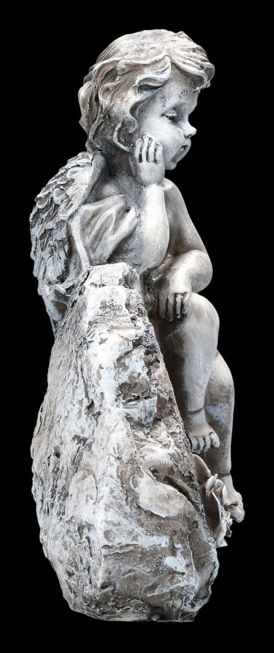 Nachdenklich, sein Kinn in die Hand gestützt, sitzt der kleine Engel auf dem mit Rosen verzierten Grabstein mit der Innschrift ‚Wir vermissen Dich‘. Der schöne Grabengel ist detailreich aus handbemaltem Kunststein (Polyresin) gefertigt. Der Engel auf dem Grabstein hat eine Höhe von 26 cm, eine Breite von 24 cm und eine Tiefe von 10 cm und er zeigt deutlich: Jeden Tag sind unsere Gedanken bei Dir.