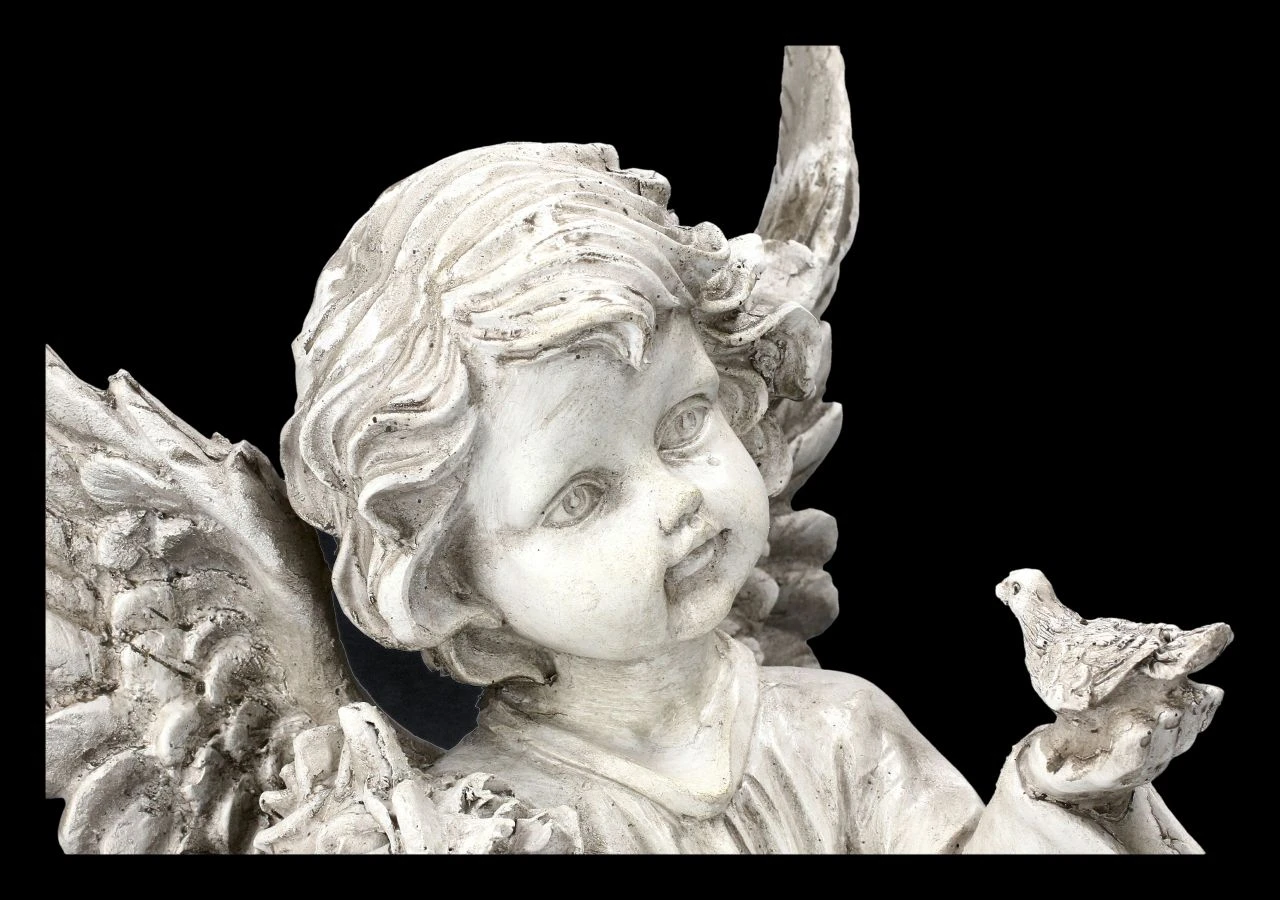 Ein kleiner Vogel hat sich auf den Arm des bezaubernden knieenden Grabengels gesetzt. Die 28 cm hohe, 20 cm breite und 17 cm tiefe Grabengel Figur ist wunderschön im nostalgischen Stil aus handbemaltem Kunstein (Polyresin) gefertigt. Der kleine Engel mit seinem gefiederten Freund und dem Rosenstrauß im Arm ist so niedlich, dass er jedem auch in seiner Trauer ein kleines, tröstendes Lächeln entlocken wird.