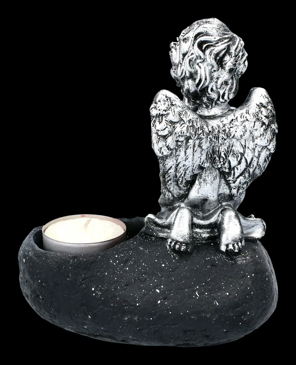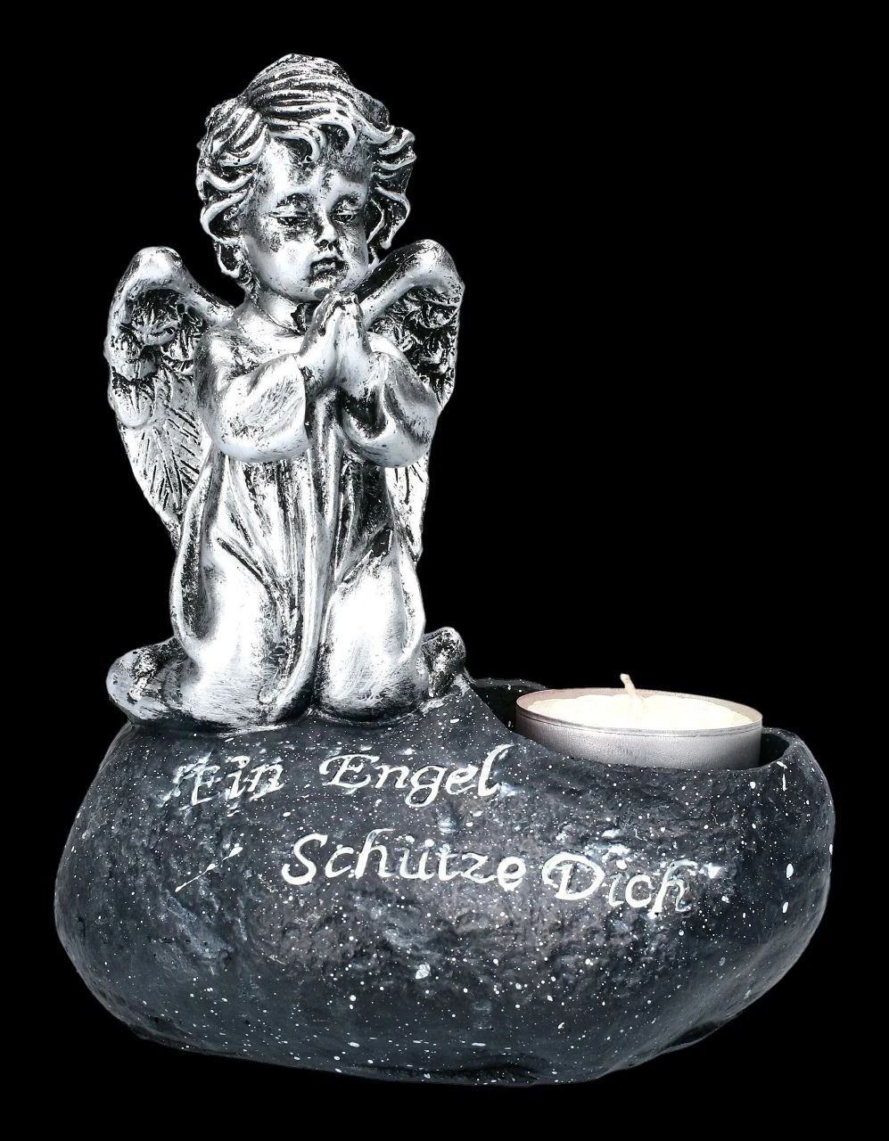 Ein niedlicher, barock aussehender kleiner Engel kniet betend auf einem wie aus einem Granitblock gearbeitetem Stein mit der Inschrift ‚Ein Engel Schütze Dich‘. Neben dem Engel ist eine Öffnung für ein Teelicht angebracht. Der Grabengel ist aus liebevoll handbemaltem Kunststein (Polyresin) gefertigt und hat eine Höhe von 15,5 cm, eine Breite von 12,5 cm und eine Tiefe von 9,5 cm. Die Lieferung erfolgt ohne Teelicht.