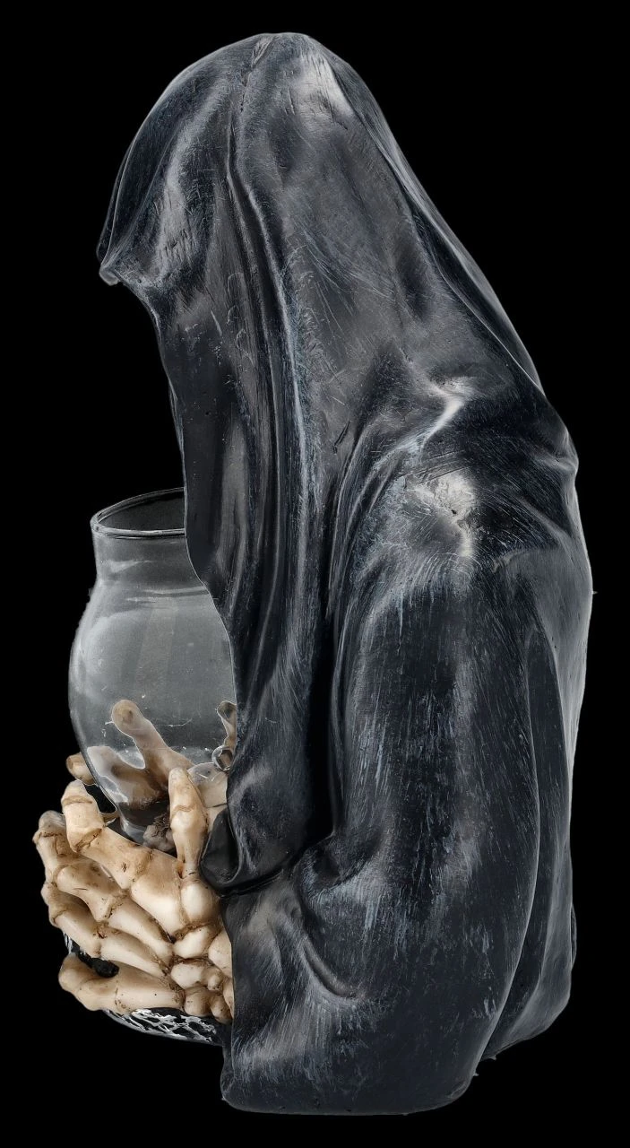 Kalte Schauer laufen sicher jedem über den Rücken, der diesen gruselig grinsenden Grim Reaper sieht, der die Lampe mit dem Lebenslicht in seinen knochigen Händen hält. Durch die batteriebetriebene LED-Beleuchtung mit Farbwechsler in der Glaslampe bekommt die 21,5 cm hohe, 14 cm breite und 11 cm tiefe Grim Reaper Büste aus handbemaltem Kunststein (Polyresin) einen zusätzlichen Gruseleffekt. Diese Sensenmann-Figur ‚Dein Ende naht‘ ist nicht nur für Halloween eine schauerliche Deko. Für die LED-Beleuchtung werden 3 x LR41 Batterien benötigt, die nicht in der Lieferung enthalten sind.
