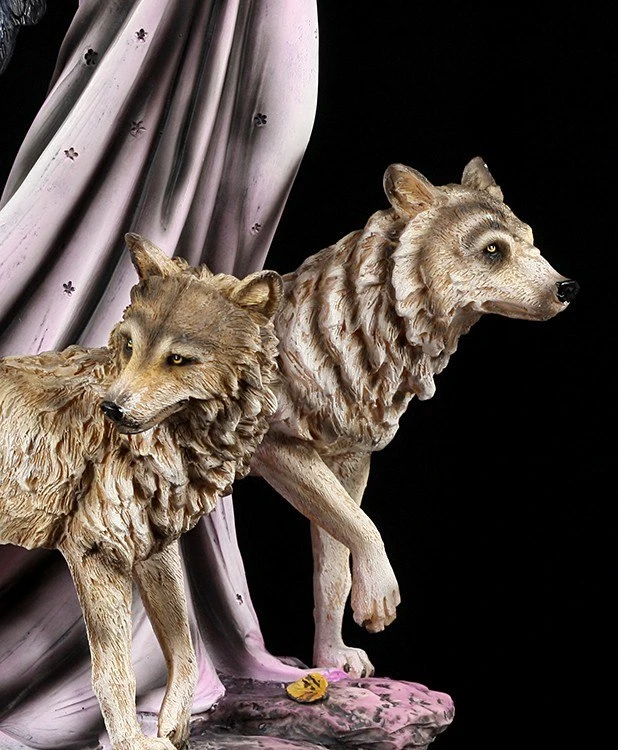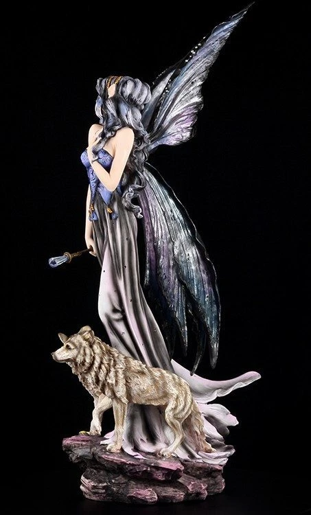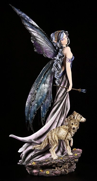 Mit ihren zwei Jungwölfen streift die Elfe Mysitque durch den Wald. Wirkt sie nicht unheimlich geheimnisvoll? Mit ihrem nachtfarbenen Kleid und den dunklen Flügeln wirkt die Elfe äußerst rätselhaft.