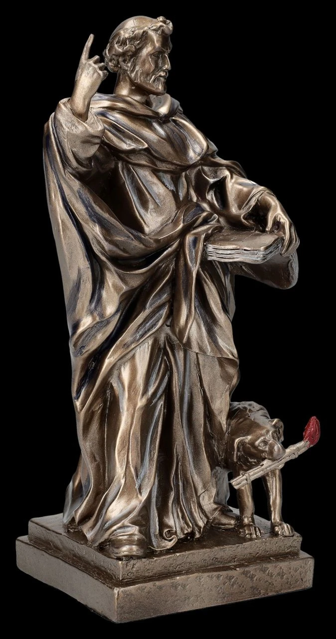 Die edle Figur des Heiligen Domenikus mit seinem Hund stammt aus der Summit Collection von Veronese. Der in Spanien geborene Priester stammte aus einer deutsch-kastilischen Gutsbesitzerfamilie und war der Stifter des Dominikanerorden. Er war überzeugt von der Güte und Liebe Gottes und versuchte in seinem Leben stets, gewaltfrei und ohne Vorurteile auf jeden zuzugehen. Sein Gedenktag ist der 8. August. Aus den Überlieferungen ist zu entnehmen, dass seine gläubige Mutter vor seiner Geburt ein Hündchen sah, das mit einer Fackel im Maul die Welt erleuchtete. So wird in zahlreichen Darstellungen der Heilige Domenikus meist von einem Hund mit einer Fackel begleitet, wie auch bei dieser edel bronzierten Figur aus fein coloriertem Kunststein (Polyresin). Da er selbst als äußerst gebildet galt und für ihn eine gute Bildung für alle große Bedeutung hatte, wird er auch meistens mit einem Buch in der Hand abgebildet. Die 20 cm hohe, 10 cm breite und 8,5 cm tiefe Heiligenfigur des Domenikus ist also nicht nur für Gläubige, sondern auch für jeden, der Wert auf eine gute Bildung und Ausbildung legt, ein perfektes Geschenk.