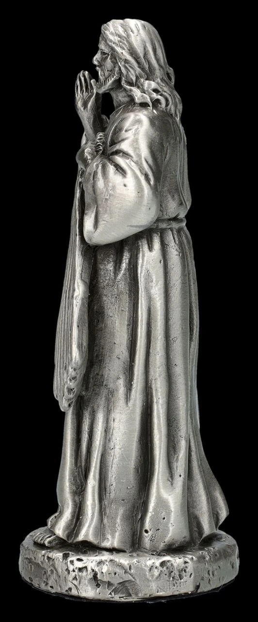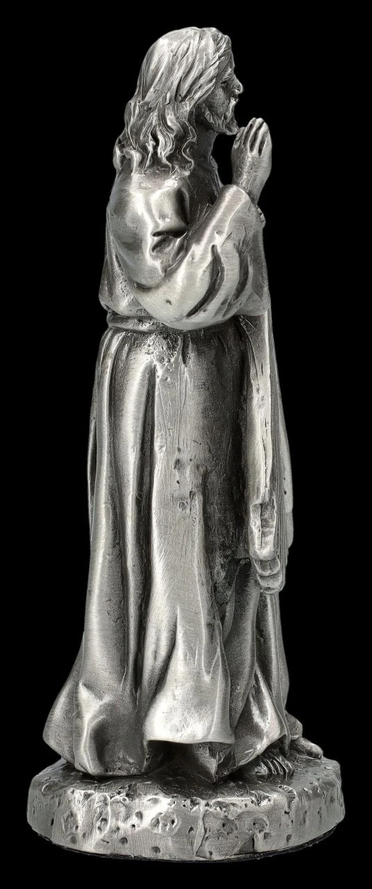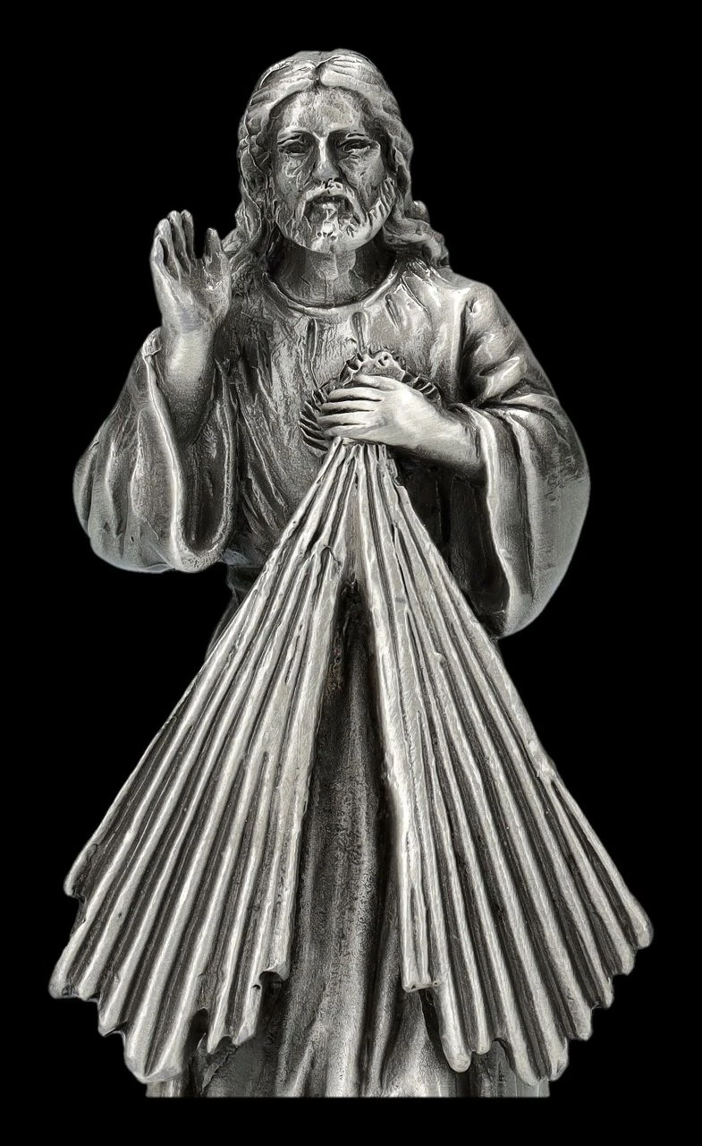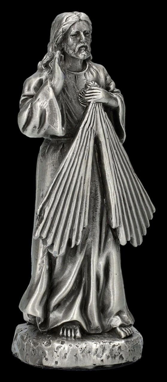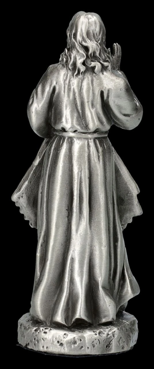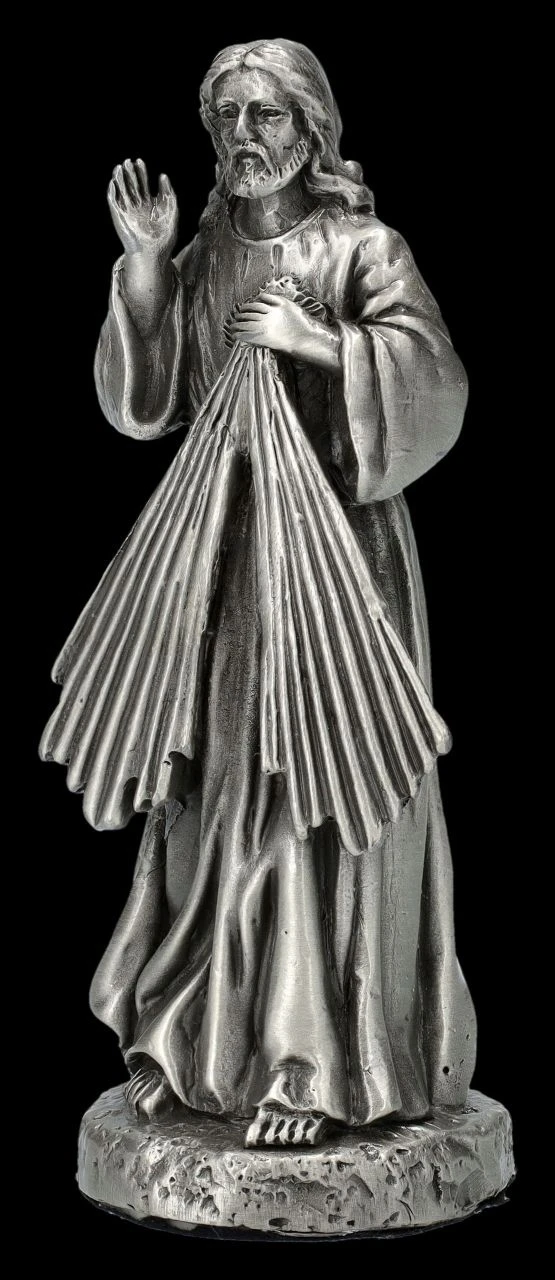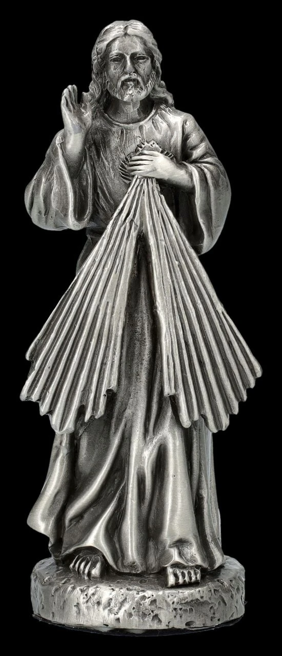 Beinahe wie eine mittelalterliche Figur wirkt diese wunderbare kleine handbemalte, 11 cm hohe, 4,5 cm breite und 4,5 cm tiefe Heiligen Figur aus Zinn. Die schöne Zinn- Figur ‚Jesus Göttliche Barmherzigkeit‘ ist nicht nur für Gläubige, sondern auch für Sammler von Zinnfiguren ein wunderbares Geschenk. Jesus steht bei dieser schönen Heiligenfigur auf einem Stein und seine linke Hand weist auf das von einem Strahlenkranz umgebene Herz, von dem dann große Strahlen ausgehen. Die ‚Göttliche Barmherzigkeit‘ wird nicht nur im Christentum, sondern auch im Judentum und im Islam als die wichtige Eigenschaft Gottes angesehen und nach der christlichen Tradition verkörpert Jesus als Symbol der Hoffnung diese ‚Göttliche Barmherzigkeit‘.