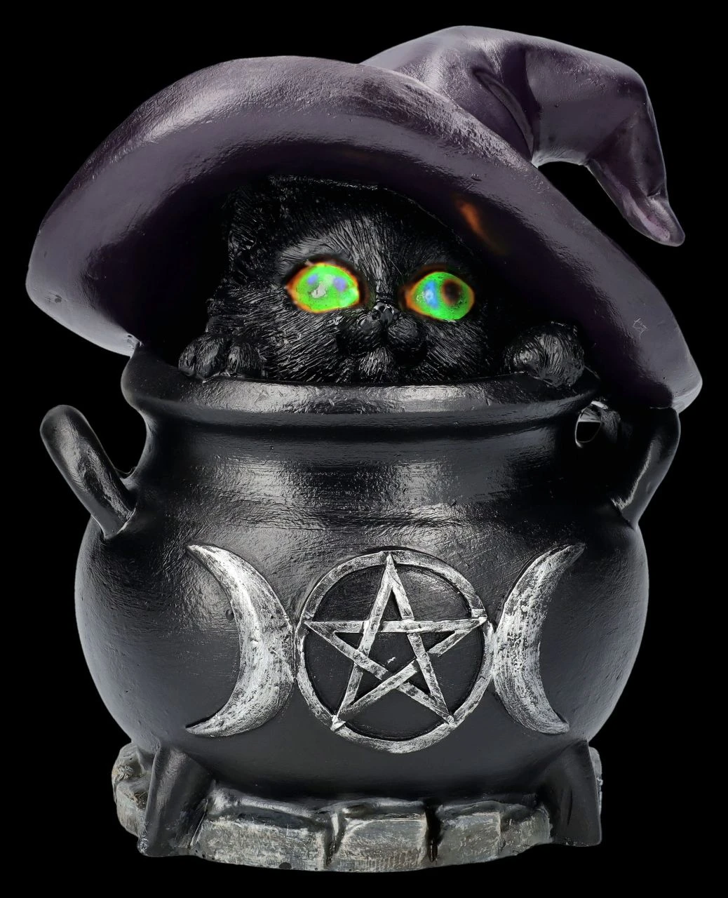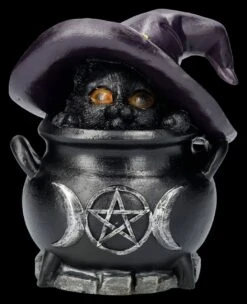 ‚Peek-a-Brew‘, oder ‚Schau dir dieses Gebräu mal an’… Ob das Versteck in dem Hexenkessel von der kleinen schwarzen Hexenkatze wohl gut gewählt war? Da kann man doch nur hoffen, dass niemand auf die Idee kommt, Feuer unter dem Kessel zu machen. Aber keine Angst, durch die LED-Beleuchtung können die Augen der Hexenkatze dann gefährlich funkeln und jeden abschrecken, der auf diese doofe Idee kommt. Die 14 cm hohe, 13 cm breite und 12,5 cm tiefe Hexenkatze im Kessel ist aus liebevoll handbemaltem Kunststein (Polyresin) und sollte in keinem Hexenhaushalt fehlen und ist auch ein wunderbares Geschenk für große und kleine Hexen. Für die batteriebetriebene LED-Beleuchtung mit Farbwechsler werden 2 x AA Batterien benötigt, die in der Lieferung nicht enthalten sind.