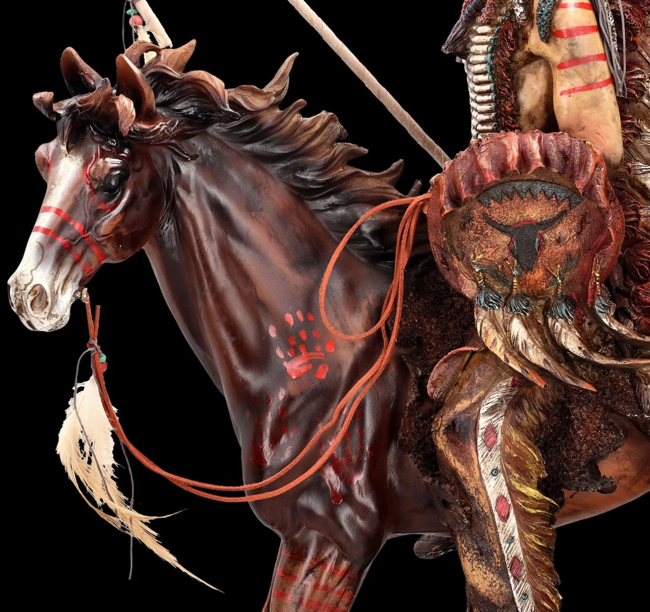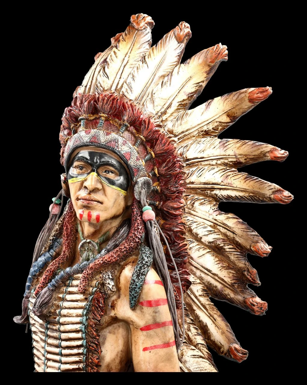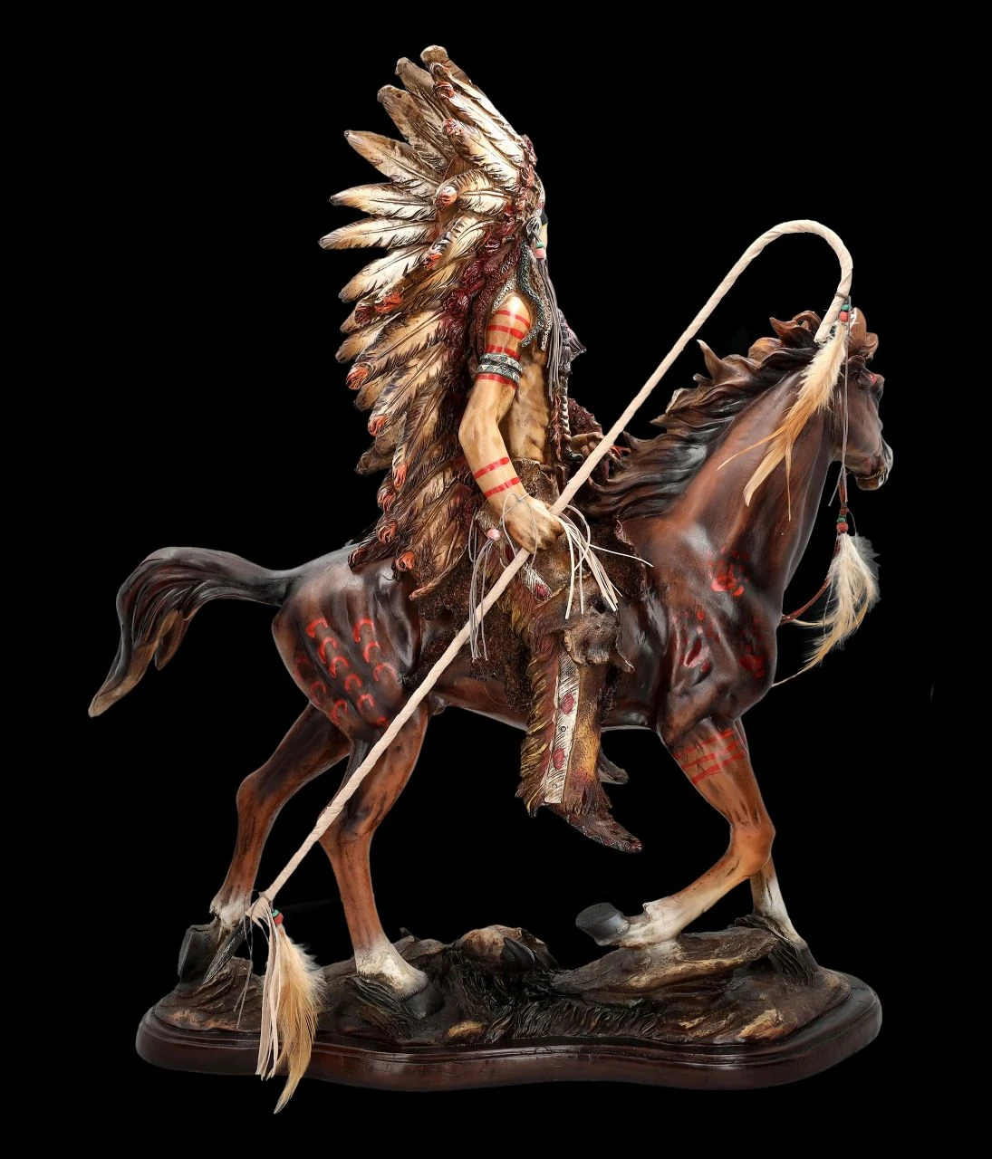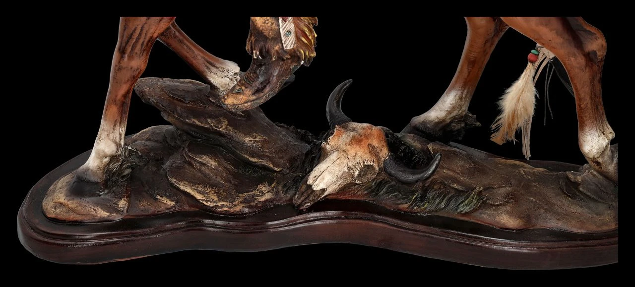 Der alte Häuptling hat zum große Palaver gerufen und die Häuptlinge aller Stämme kommen. Schließlich geht es darum, die Angriffe auf ihr Land zu verhindern. Dieser stürmische junge Häuptling hat seinen prächtigen Federschmuck angelegt. Hoch aufgerichtet und stolz sitzt er auf seinem edlen Pferd und trägt bereits die Kriegsbemalung und Ausrüstung. Er möchte damit kämpferisch zeigen, dass er nicht bereit ist, kleine Kompromisse einzugehen. Der junge Häuptling möchte offensichtlich bei den Verhandlungen den Vortritt vor den ehrwürdigen Alten haben. Die sehr beeindruckende XXL Indianer Figur eines stolzen Häuptlings auf dem edlen Pferd ist 71 cm hoch, 60 cm breit und 24 cm tief. Sie wurde aufwändig und hochwertig aus sorgfältig handbemalten Kunststein (Polyresin) gefertigt. Die mit echten Federn geschmückte prächtige Figur mit den vielen Details wird überall zum absoluten Blickfang. Sie ist eine fantastische Deko für einen Western-Saloon, eine Bar oder auch bei Vorführungen in Western-Dörfern. Der Häuptling mit Pferd ist aber auch ein perfektes Geschenk für jeden, der von der Geschichte des amerikanischen ‚Wilden Westens‘ und der indianischen Ureinwohner fasziniert ist. Die Lieferung erfolgt mit einer Spedition frei Bordsteinkante.