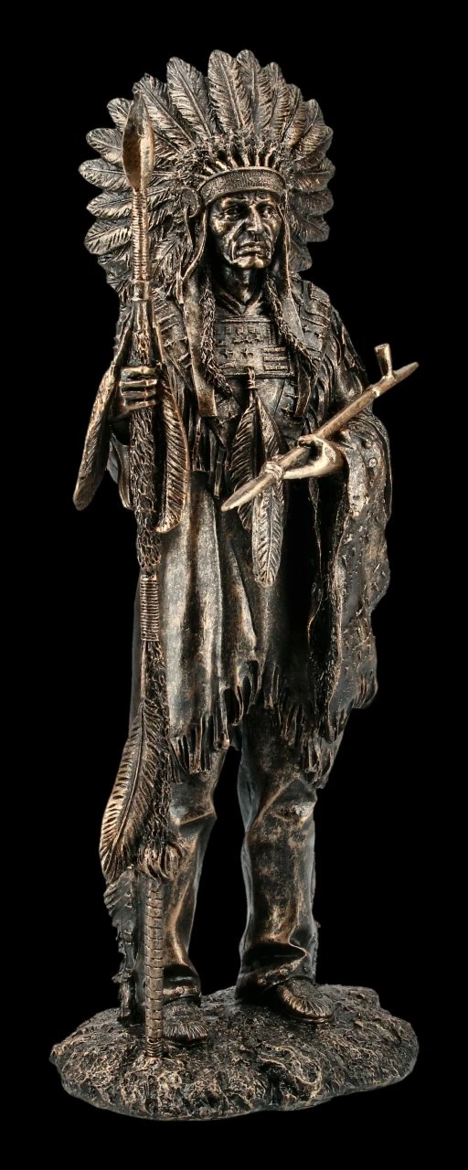 Ein Sprichwort der Indianer sagt u.a.: ‚Der Friede stellt sich niemals überraschend ein, er kommt zu denen, die ihn vorbereiten‘. Auch wenn er mit der rechten Hand noch den Speer hält, hat der Häuptling im linken Arm bereits die Friedenspfeife vorbereitet. Mit selbstbewusstem, stolzen Blick macht dieser bronzefarben handbemalte und vielen Details sorgfältig aus Kunststein (Polyresin) gefertigte Häuptling mit Speer und Friedenspfeife eine beeindruckende Figur. Die Indianerfigur mit Speer und Friedenspfeife ist 33 cm hoch, 13,5 cm breit und 11,5 cm tief.
