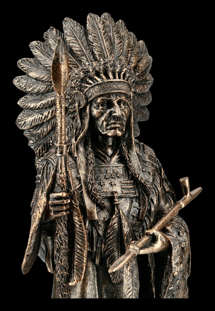 Bronzefarbene Indianerfigur: Häuptling mit Speer und Friedenspfeife