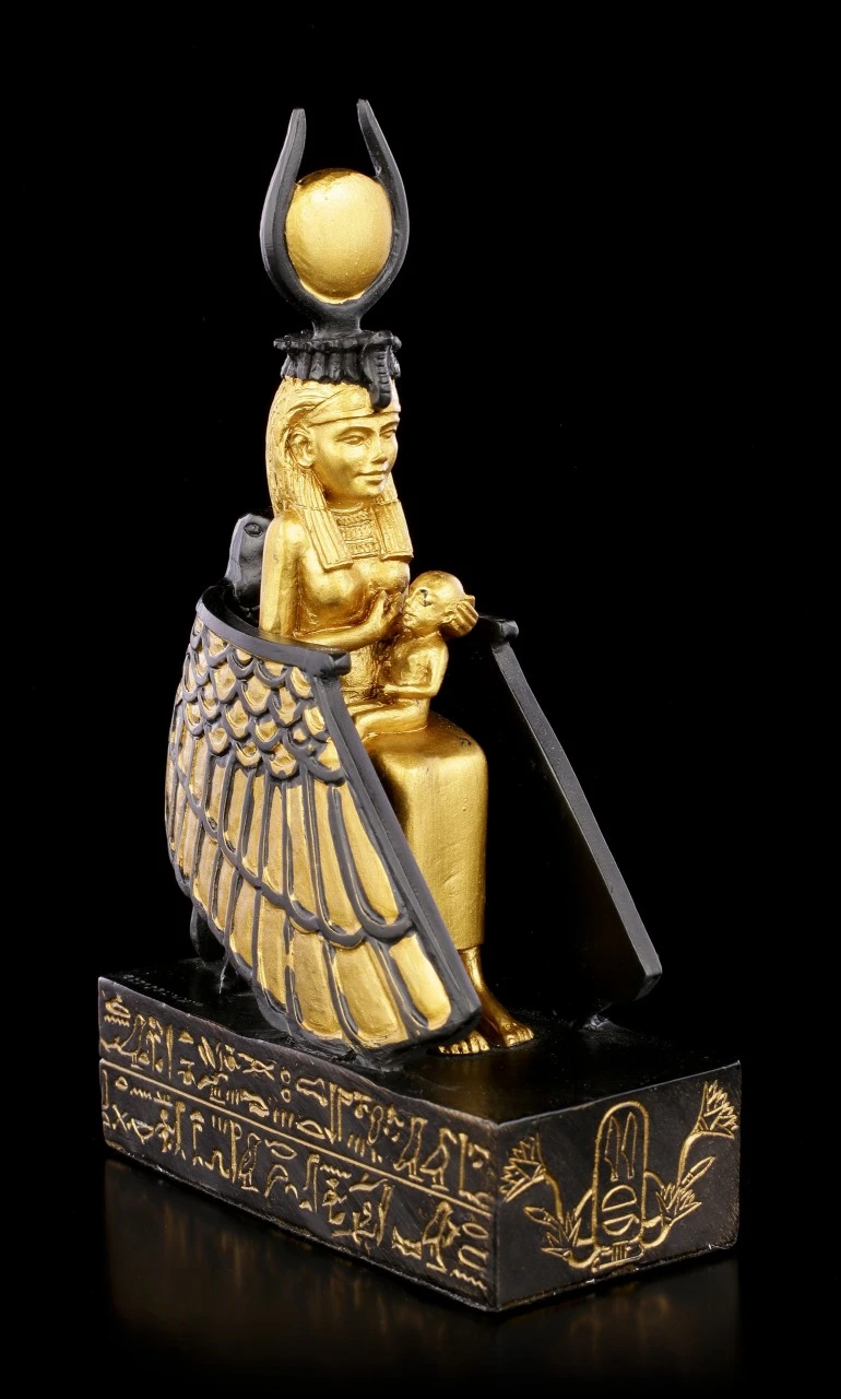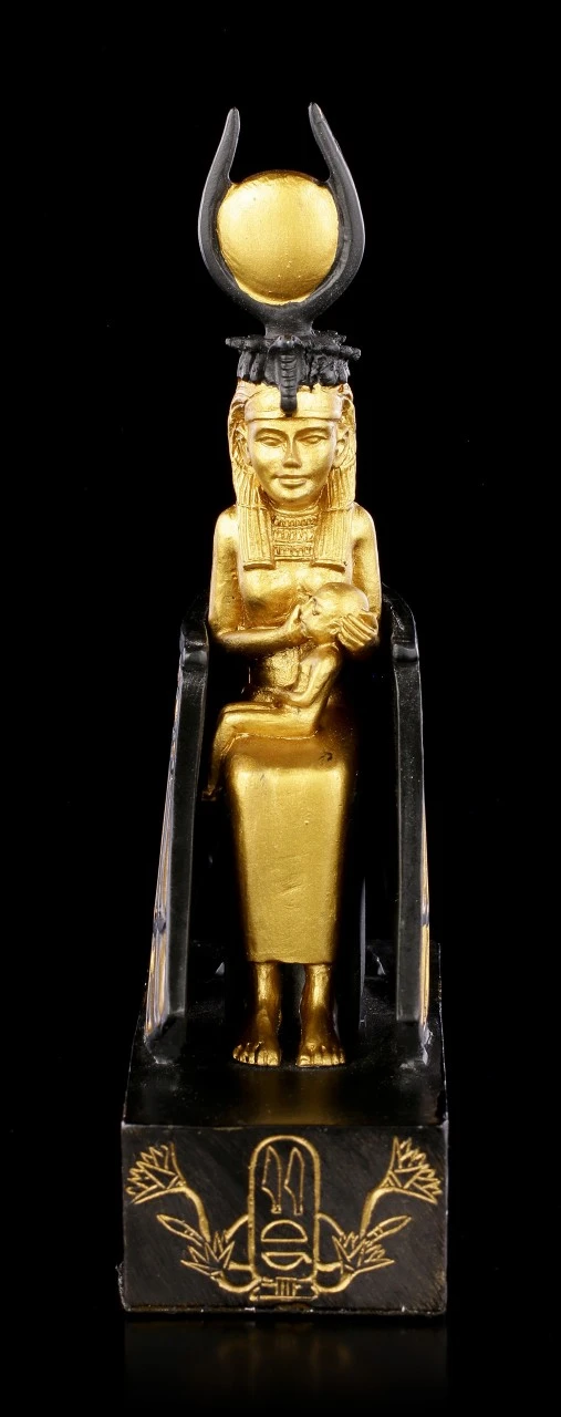 Die altägyptische Göttin Isis, Göttin der Geburt, Wiedergeburt und der Magie, sitzt auf einem Thron und stillt den Horusknaben. Diese Darstellung wird als Inspiration vieler Madonnendarstellungen angenommen. Diese wunderschöne Figurine aus Kunststein (Polyresin) ist in schwarz und gold handbemalt.