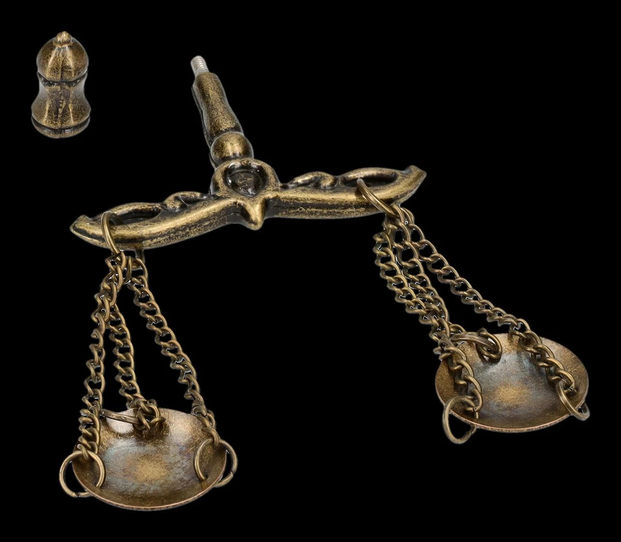 Mit verbundenen Augen, die zeigen sollen, dass sie ohne Ansehen einer Person gerecht urteilt, kniet die Römische Göttin Justitia auf dem schlichten und am Rand verzierten Podest. In ihrer rechten Hand hält sie das Schwert, das die Härte der Strafe demonstriert und mit ihrer linken Hand hält Justitia die Waage, die für ein gerechtes Urteil steht. Die 17 cm hohe, 6 cm breite und 13,5 cm tiefe Justitia Figur aus der Studio Collection von Veronese ist aus hochwertigem Kunststein (Polyresin) gefertigt. Durch die Bronzierung und sehr feine Colorierung wirkt sie ausgesprochen edel und ist damit nicht nur ein perfektes Geschenk zum bestandenen Staatsexamen, sie ziert natürlich auch den Arbeitsplatz eines Richters, Juristen oder Notars. Die Waage ist übrigens zum Schrauben.