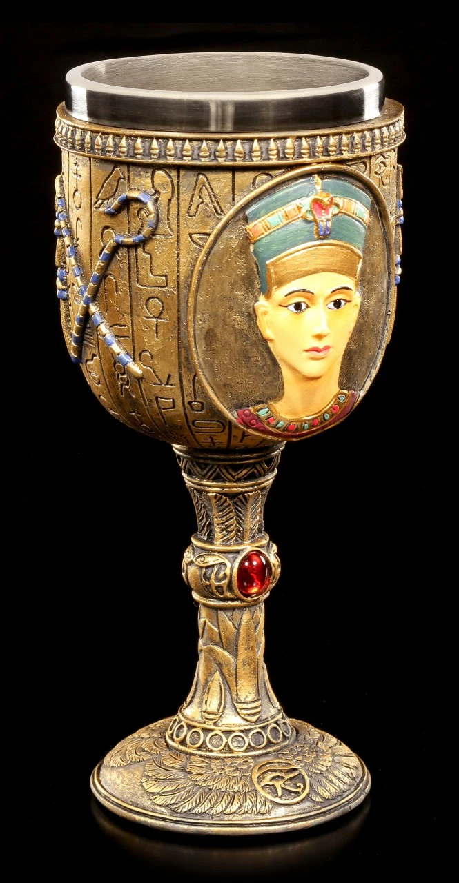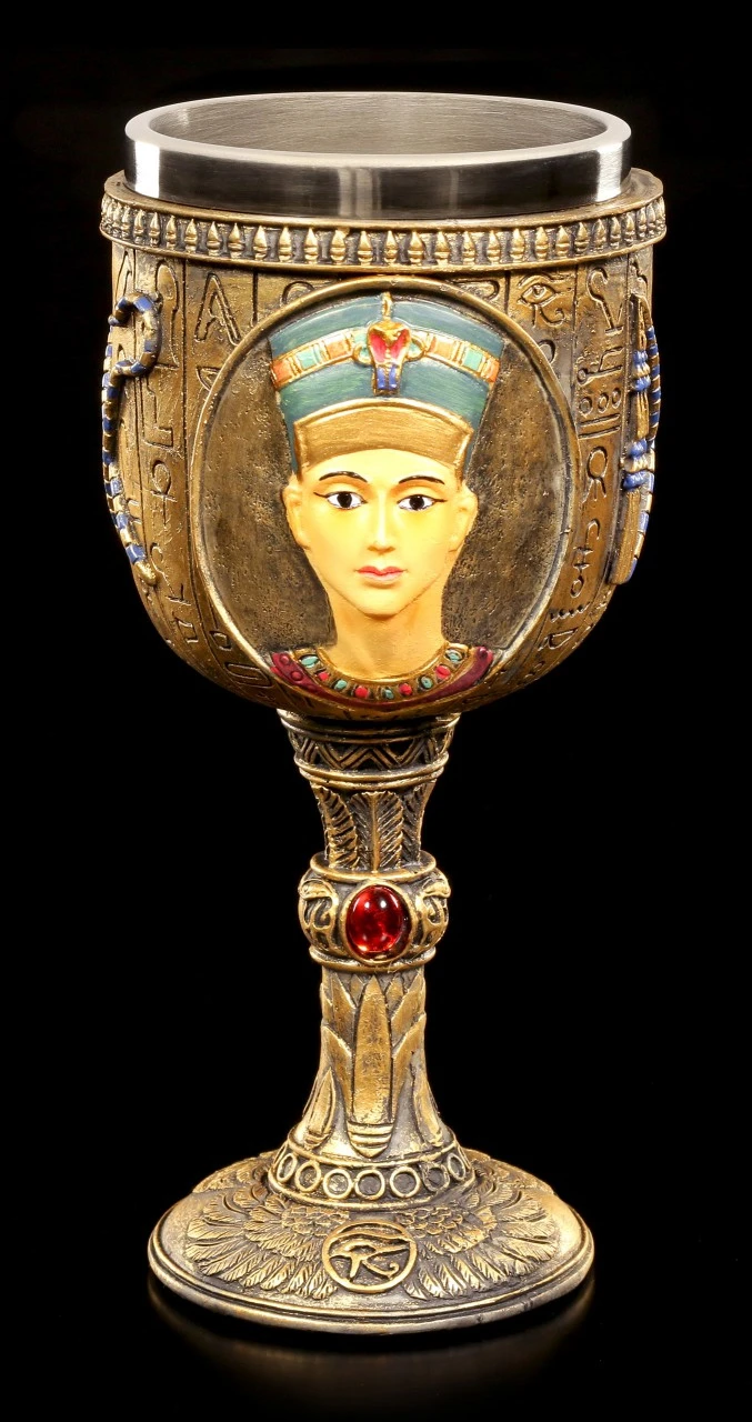 Nofretete, oder auch in anderen Sprachen Nefertiti, war die Hauptgemahlin des ägyptischen Pharaos Echnaton. Genießen Sie Ihren Wein stilecht in diesem handbemalten Kelch zusammen mit Ägyptens schönster Frau.