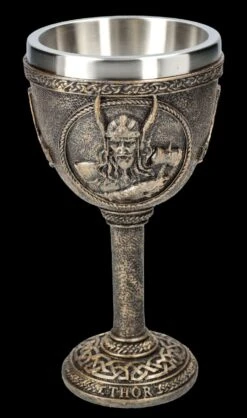 ‚Ein Hoch auf Thor, den Wetter- und Donnergott und Sohn des großen Odin‘. Für manche Gegenden ist es sehr wichtig, mit Met oder Wein auf Thor anzustoßen, denn er bringt nicht nur Regen, sondern damit verbunden auch fruchtbare Böden. Dafür wurde er von den Germanen und Wikingern im hohen Norden verehrt. Thor mit seinem Hammer hebt sich plastisch wie ein Emblem vom Hintergrund des 19 cm hohen, 10,5 cm breiten und 10,5 cm tiefen schön verzierten Kelches ab. Der fantastische Kelch aus metallfarben handbemaltem Kunststein (Polyresin) ist für jeden Wikinger ein perfektes Geschenk. Zur einfacheren Reinigung hat der tolle Kelch einen herausnehmbaren Einsatz aus Edelstahl mit dem Fassungsvermögen von ca. 250 ml. Gemeinsam mit dem Wikinger Kelch mit dem Emblem von Odin aus unserem Shop schmückt er jede Tafel.
