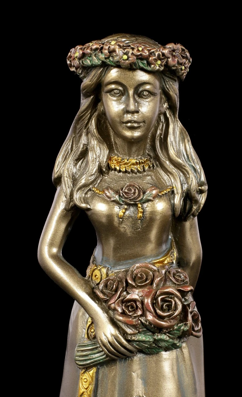 Die Jungfrau gilt in der keltischen Mythologie als eine Erscheinungsform der Dreifaltigen Göttin. Die Jungfrau verkörpert den Anfang des Lebens und die Jugend dar. Sie strebt nach Liebe. Sie wird oft mit einem Blumenkranz auf dem Kopf und mit Blumen in der Hand abgebildet. Die wunderschön bronzierte und colorierte keltische Göttin aus Kunststein (Polyresin) glänzt sanft im Licht und bringt so die keltische Mystik in Ihre Zimmerdekoration.