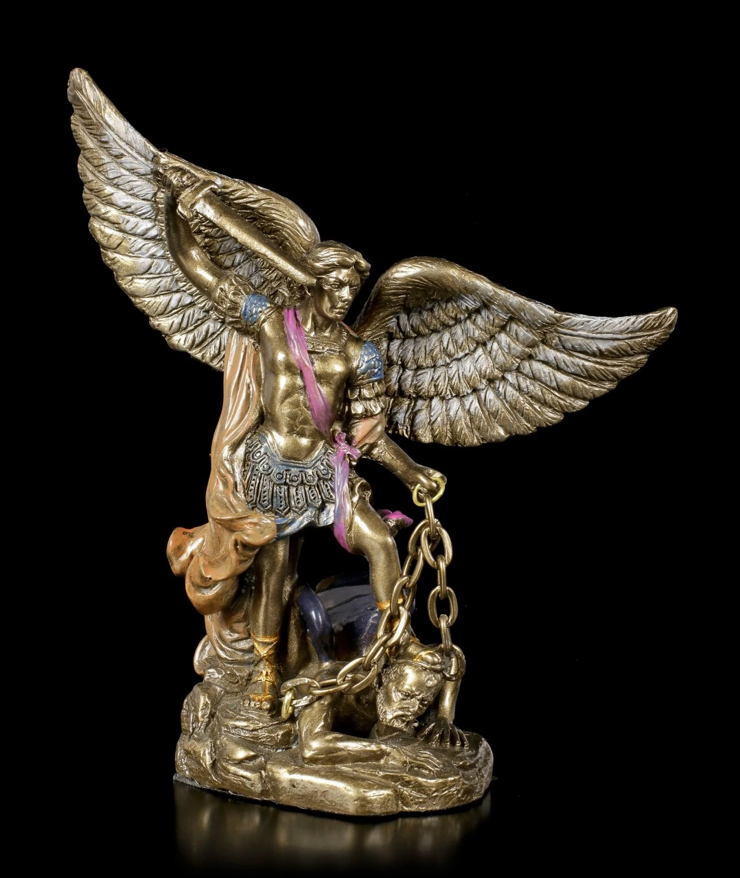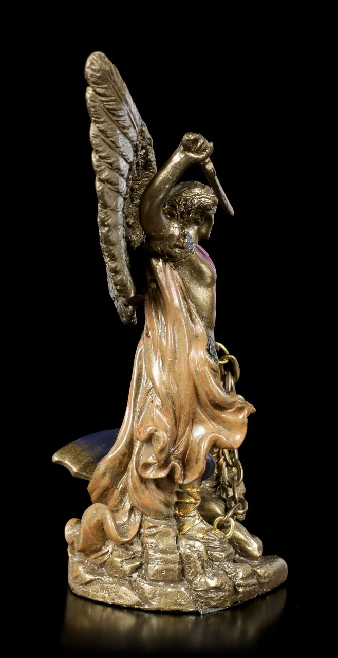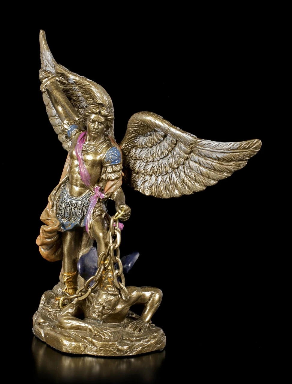 Die bunte, bronzierte Kunststein Figur zeigt den Erzengel Michael, wie er gerade den Teufel besiegt. Die kleine Figur ist für jeden Engel Sammler eine wunderbares Geschenk. Michael ist einer der wenigen Gestalten, die in vielen Glaubensrichtungen Erwähnung findet.