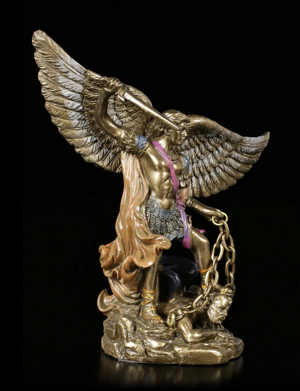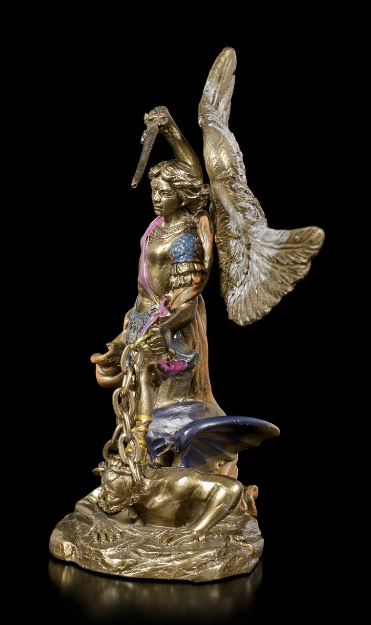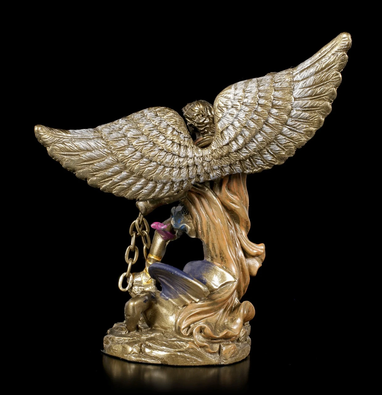 Die bunte, bronzierte Kunststein Figur zeigt den Erzengel Michael, wie er gerade den Teufel besiegt. Die kleine Figur ist für jeden Engel Sammler eine wunderbares Geschenk. Michael ist einer der wenigen Gestalten, die in vielen Glaubensrichtungen Erwähnung findet.