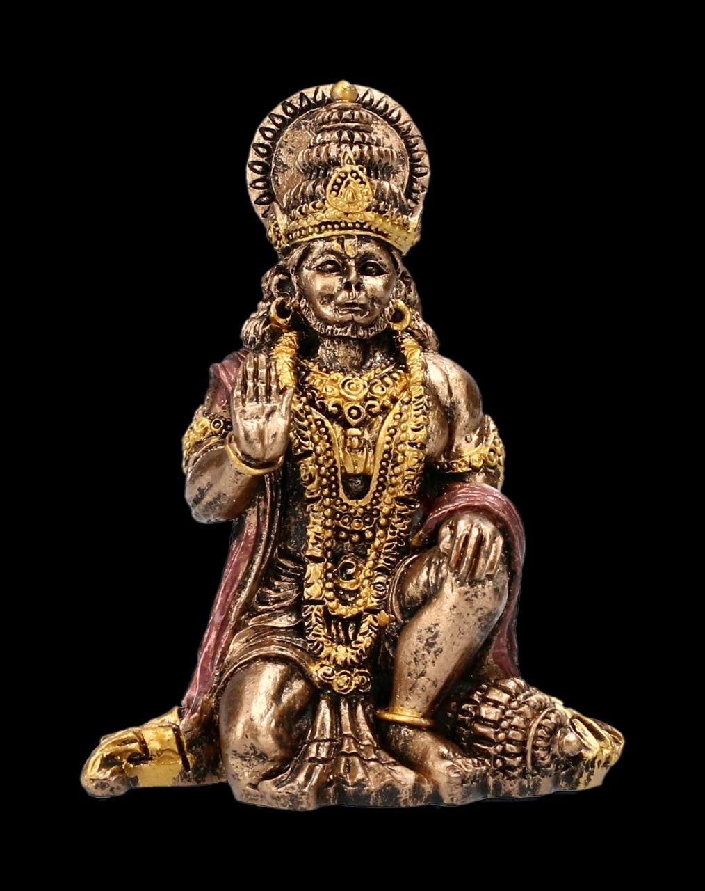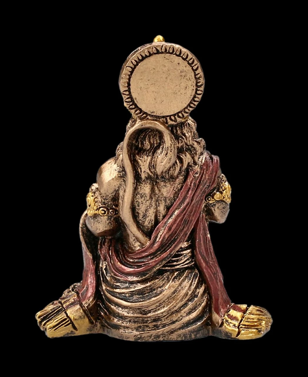 In der hinduistischen Mythologie gilt der Halbgott Hanuman als Hinweis für absolute Liebe und Hingabe. Er wird als menschengleicher Affengott angebetet und dargestellt, wie man deutlicher auf der Rückseite dieser Hanuman Figur sieht. Die kleine Hanuman Figur aus sorgfältig handbemaltem Kunststein (Polyresin) ist 7 cm hoch, 5,5 cm breit und 4 cm tief und wirkt fast wie eine antik aussehnde Darstellung des Affengottes. Sie ist auch ein schönes Geschenk für einen lieben Menschen.
