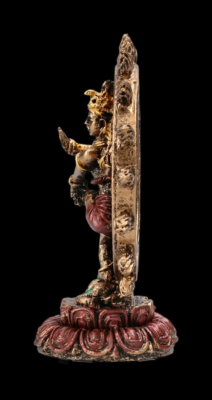 Nataraja stellt Shiva als König des Tanzes dar, der auf einem Zwerg den Tanz des Universums tanzt. Der Flammenkreis soll die Energie symbolisieren. Als Nataraja ist Shiva auf vielen Abbildungen hinduistischer Götter zu sehen. Die kleine Shiva Nataraja Figur ist aus sorgsam handbemaltem Kunststein (Polyresin)gefertigt. Sie ist 7,5 cm hoch, 6,5 cm breit und 3,5 cm tief. Sie ist ein dekorativer Mittelpunkt im Kreis der anderen kleinen hinduistischen Götterfiguren aus unserem Shop.