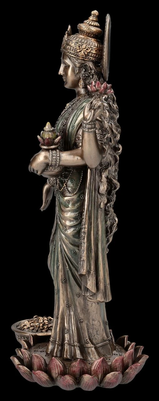 Lakshmi, die hinduistische Göttin der Liebe, der Fruchtbarkeit, der Gesundheit und Schönheit ist auch Spenderin von Reichtum, von Fülle und Glück. Nach der hinduistischen Mythologie ist sie einst in einer Lotusblüte aus dem ‚Milchsee des Universums‘ aufgetaucht. In einer Lotusblüte steht auch diese wunderbare Figur der Göttin des Glücks und des Wohlstands. Sie ist in einen zarten Sari gehüllt und mit Schmuck behangen. In einem ihrer vier Arme hält sie einen Kessel, ihren beiden erhobenen Händen hält sie – wie in zahlreichen Darstellungen der Göttin – jeweils eine Lotusblüte und mit dem anderen Arm segnet sie ihre Anhänger. Zu Füßen der schönen Lakshmi Figur aus edel bronziertem und zart coloriertem Kunststein (Polyresin) steht ein Kessel voller Münzen. Die 25,8 cm hohe, 13 cm breite und 9,5 cm tiefe wunderschöne Lakshmi Figur aus der Studio Collection von Veronese ist nicht nur sehr dekorativ und bringt asiatisches Feeling in jedes Ambiente, sie ist auch ein wunderbares Geschenk für jeden, dem man Glück, Gesundheit und Reichtum wünscht.