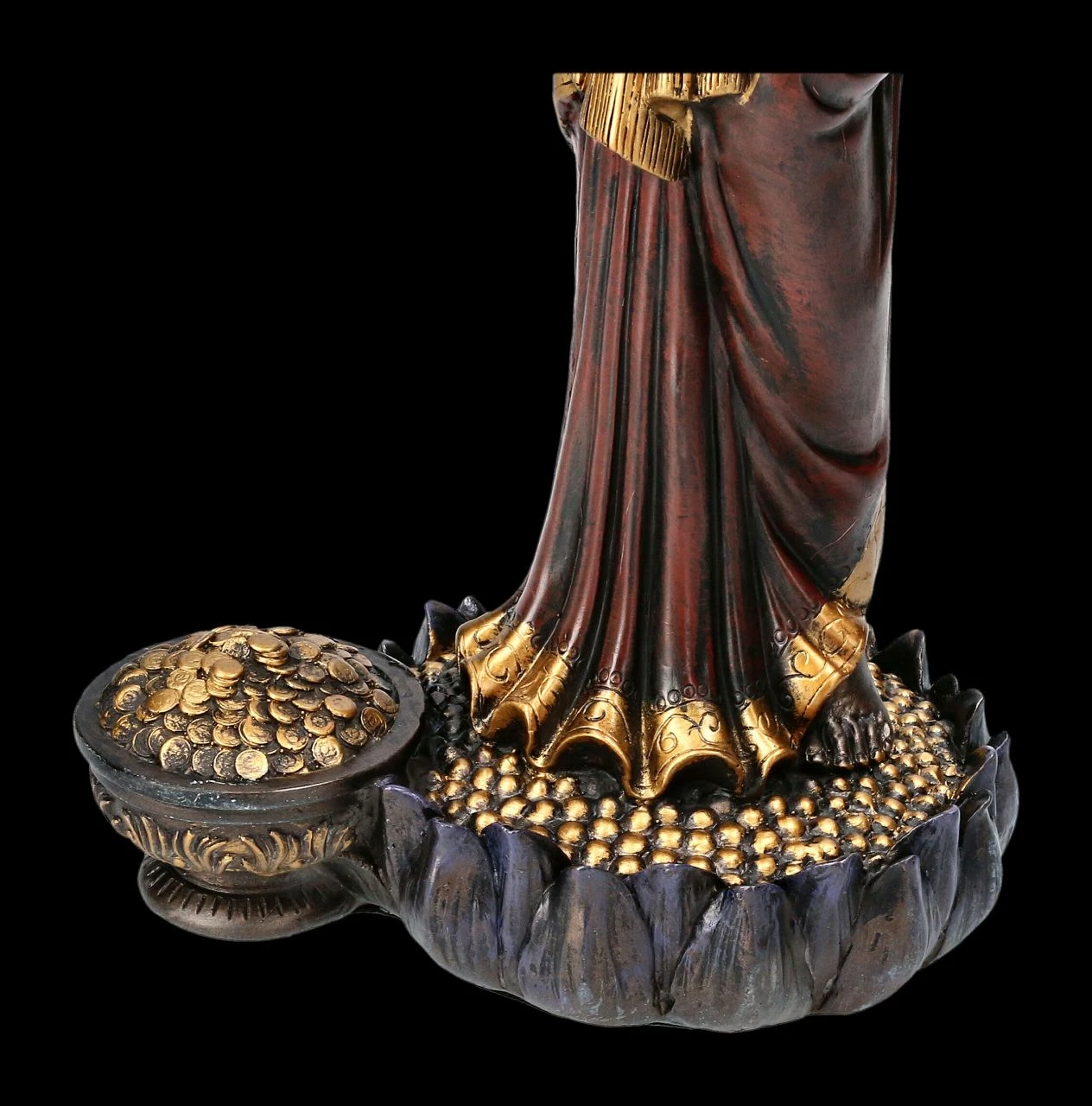Beim Figuren Shop natürlich. Lakshmi, die hinduistische Göttin des Glücks, der Liebe, der Fruchtbarkeit, der Gesundheit und der Schönheit wird auch als Spenderin von Harmonie, geistigem Wohlbefinden, aber auch von Fülle, Überfluss und Reichtum verehrt. All diese Attribute zeigt diese wunderschöne, edle Lakshmi-Figur. Die bronzefarbene Figur, die – einen Kessel mit Münzen neben sich, auf einer mit goldenen Perlen gefüllten Lotusblüte steht, ist außerordentlich detailreich aus Kunststein (Polyresin) gefertigt und auch mit viel Liebe zum Detail handbemalt. Die außerordentlich dekorative Figur ist 49 cm hoch, 20 cm breit und 12,5 cm tief. Sie ist auch ein wunderbares Geschenk für jeden, dem Sie Glück wünschen möchten.
