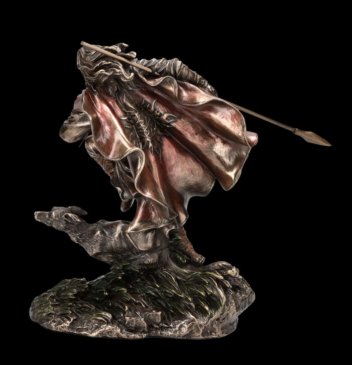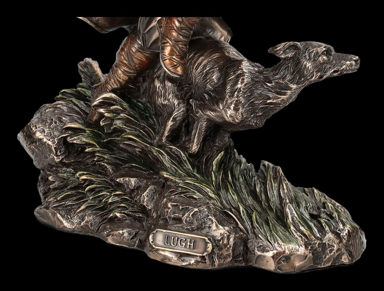 Der keltischen Legende nach stammte Lugh u.a. vom Volk der Túatha de Danann ab. Die Nachkommen der Göttin Dana galten selbst als Götter – wie auch Lugh. Er wurde als der keltische Gott der Sonne, der Künste und des Handwerks verehrt. Im altirischen bedeutet der Name ‚Der Leuchtende‘. Das keltische Fest Lughnasad wurde von Lugh im Gedenken an seine Pflegemutter Tailtiu ins Leben gerufen und wird heute noch am ersten August begangen. Lugh soll auch ein hervorragender Speerkämpfer gewesen sein, daher wird er oft mit einem Speer in der Hand dargestellt. Wie auch bei dieser 20,5 cm hohen, 21 cm breite und 9 cm tiefen kraftvoll nach vorne stürmenden Lugh-Skulptur. Die edel bronzierte und zurückhaltend colorierte Skulptur aus Kunststein (Polyresin) stammt aus der Studio Collection von Veronese. Der Speer ist zum Stecken ist. Begleitet wird der keltische Gott bei dieser Skulptur auch von seinem Jagdhund. Die Lugh Figur ist ein fantastisches Geschenk für Künstler, Handwerker und alle Anhänger der faszinierenden keltischen Geschichte.
