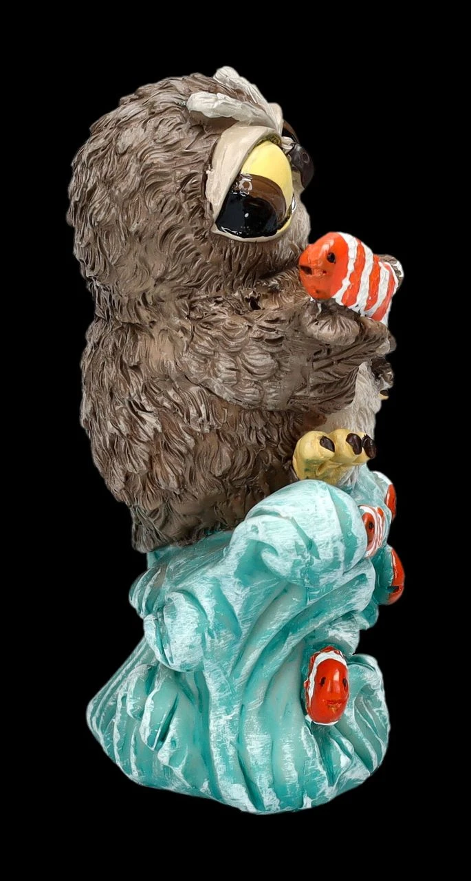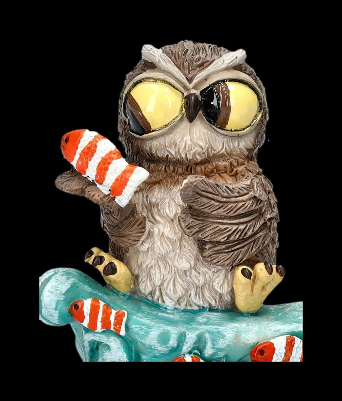 Für alle, die im Sternzeichen Fische geboren sind, aber natürlich auch für alle Fischer ist diese witzige Eule das perfekte Geschenk. Sie sieht auch allzu niedlich aus, wie sie einen der Fische, die in den Wogen zu ihren Füßen schwimmen, zärtlich in den Armen hält. Die lustige, 11 cm hohe, 8 cm breite und 5 cm tiefe Eulen-Figur mit den bunten Fischen wurde aus liebevoll handbemaltem Kunststein (Polyresin) gefertigt.
