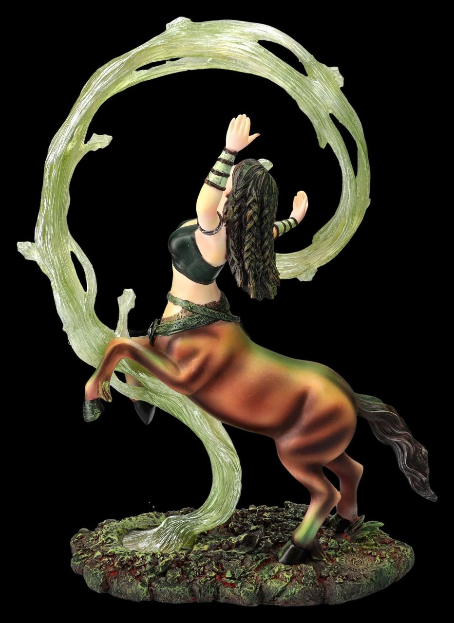 Meist werden Zentauren, die Mischwesen aus der griechischen Mythologie, halb als Pferd und halb als Mann dargestellt. Diese fantasievolle Magierin zeigt jedoch, dass alles auch anders sein kann. Wie in der Zirkusmanege wirbelt die Magierin mit dem knappen Oberteil gekonnt einen grünen Schleier. Um die Hüfte trägt sie einen Gürtel, in dessen Tasche sie vermutlich ihre magischen Kräuter bewahrt. Die fantastische, 26 cm hohe,18 cm breite und 9 cm tiefe Figur der Magierin ist wieder eine wunderbare Arbeit der berühmten Fantasykünstlerin Anne Stokes. Die Magierin, die für das Element Erde steht, wurde aus hochwertigem Kunststein (Polyresin) geschaffen und sorgfältig und detailreich von Hand bemalt. Dem Element Erde werden Menschen zugeordnet, die in den Sternzeichen Steinbock, Stier und Jungfrau geboren sind. Sie gelten eigentlich als beständig, tatkräftig, zuverlässig und bodenständig, auch wenn diese temperamentvolle Magierin anscheinend eine verborgene Seite zeigt. Diese ungewöhnliche Magierin von Anne Stokes ist auf jeden Fall ein Blickfang und ein fantastisches Geschenk. Sie kommt inklusive eines toll bedruckten Geschenkkartons.