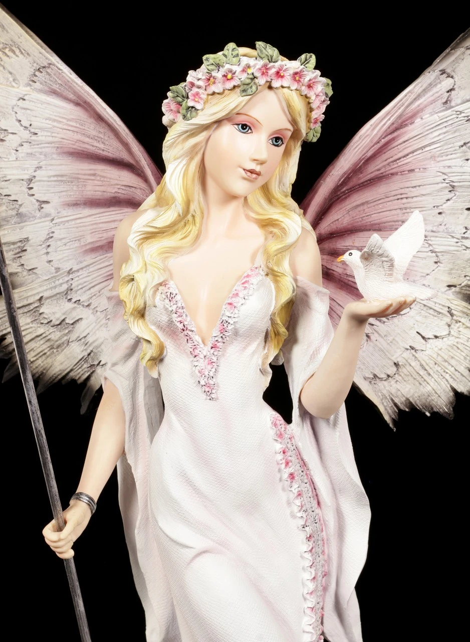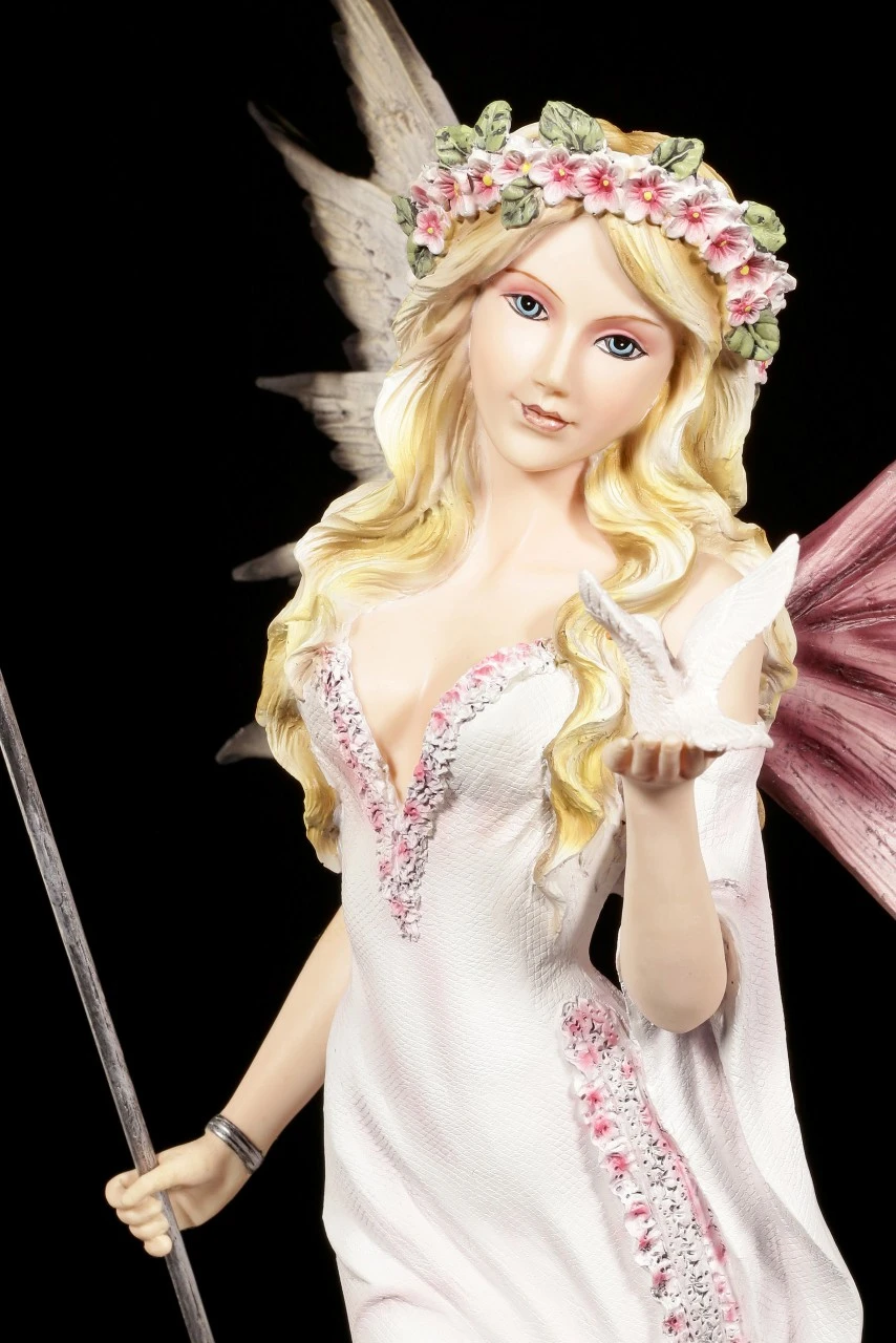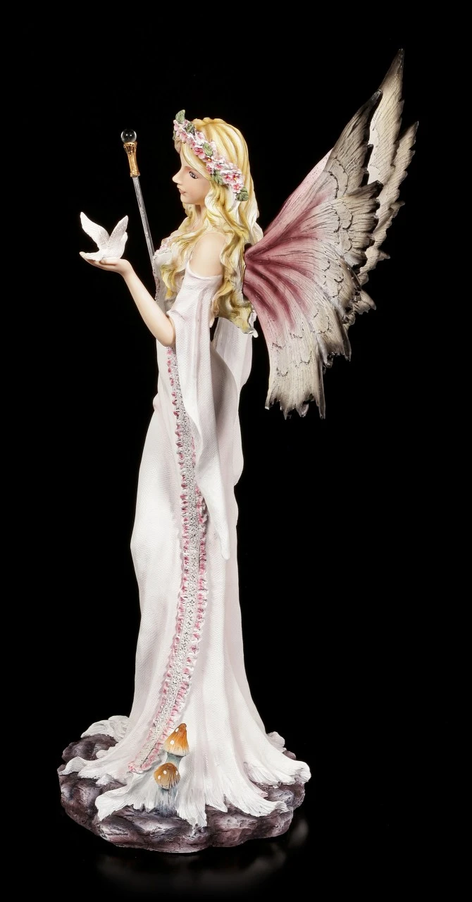 Isahia mit weißer Taube ist eine wunderschöne Kunststein Elfen Figur in Pastellfarben. Mit Ihrem Zepter, dem langen edlen Gewand und dem Blumenkranz im Haar wirkt sie wie die Königin der Elfen.