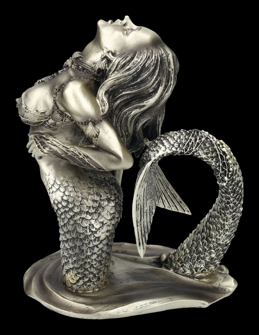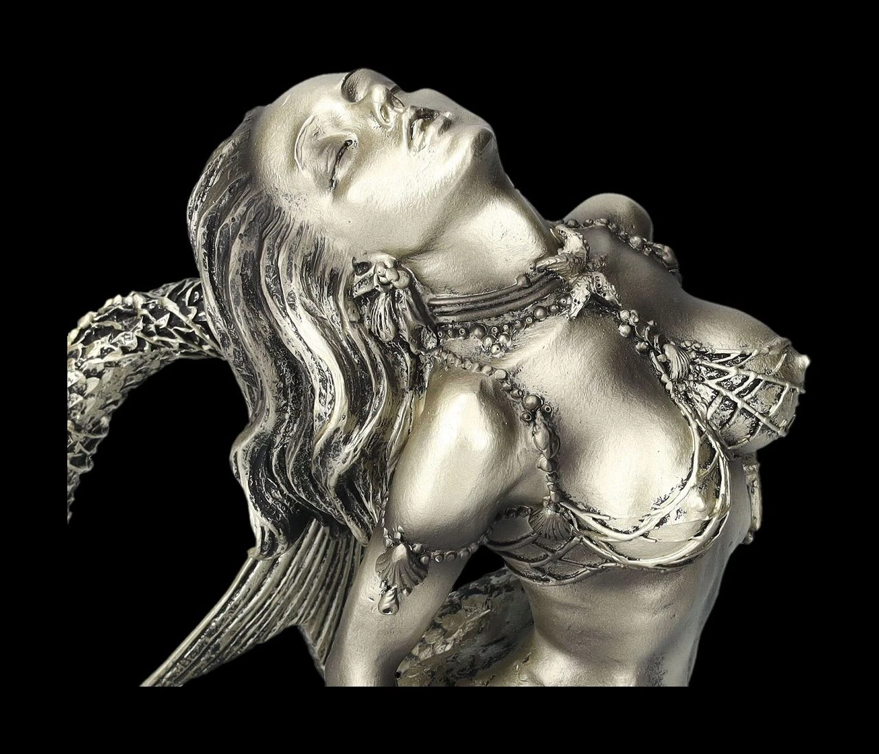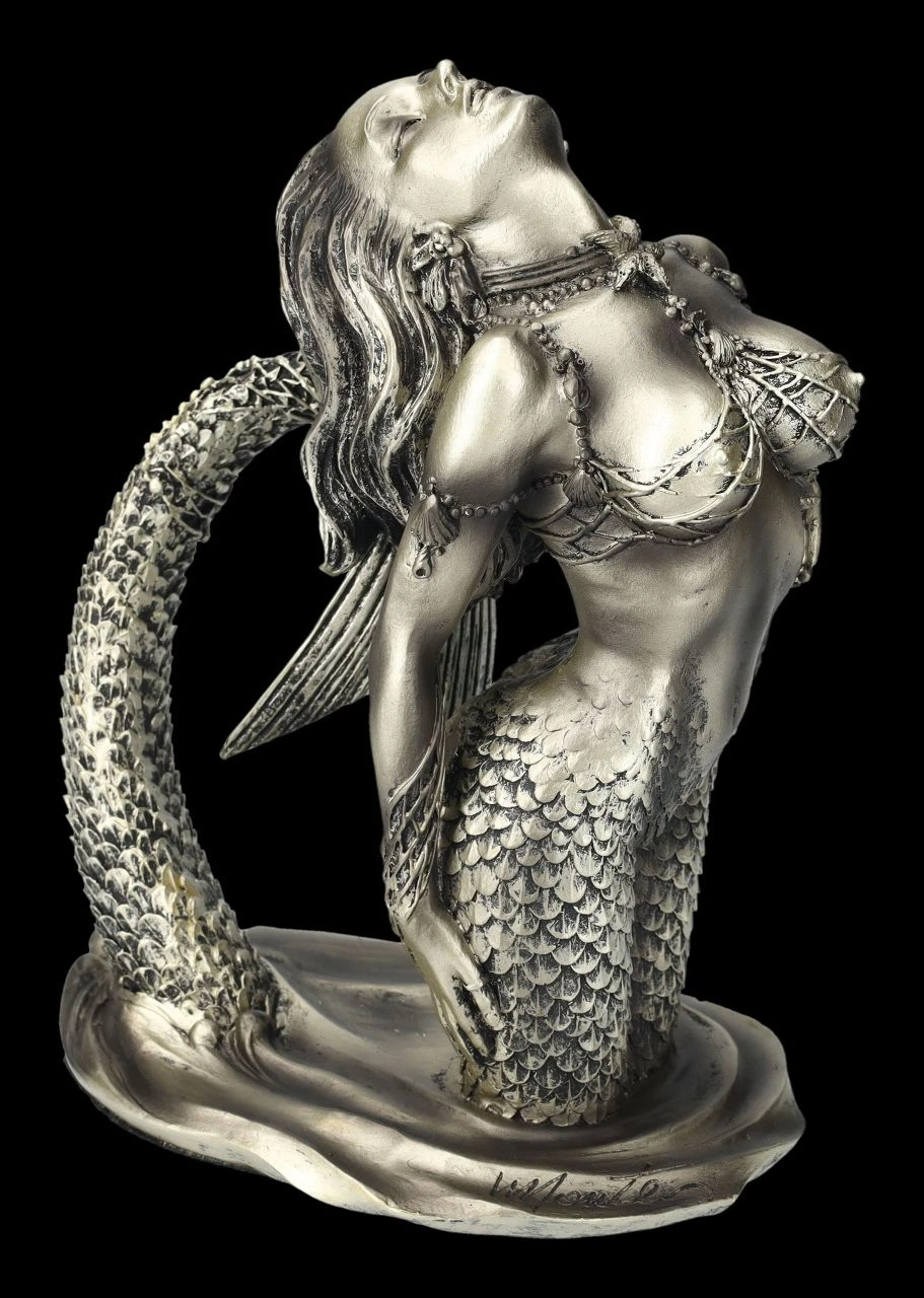 Vom amerikanischen Illustrator, Designer und Drehbuchautor Monte M. Moore stammt diese wunderschöne Meerjungfrau. In der griechischen Mythologie galten Sirenen, die als weibliche Mischwesen aus Mensch und Vogel und später auch als Mensch und Fisch dargestellt wurden, als sehr gefährlich. Durch ihren betörenden Gesang sollten sie die vorbei fahrenden Schiffe anlocken, um sie dann zu sich in die Tiefe zu reißen. So hatte sich einst Odysseus sogar die Ohren verstopft, um sich nicht von dem Gesang betören zu lassen. Hätte er aber diese wunderschöne sinnliche Sirene erblickt, wäre es trotzdem um ihn geschehen gewesen. Die herrliche Figur einer verführerischen Meerjungfrau wurde detailreich aus Kunststein (Polyresin) gefertigt und von Hand bemalt. Mit der Höhe von 19 cm, der Breite von 10 cm und der Tiefe von 14,5 cm wird sie zum absoluten Blickfang auf einem Schreibtisch oder Sideboard. Sie ist aber auch ein fantastisches Geschenk für jeden, der das Schöne liebt.