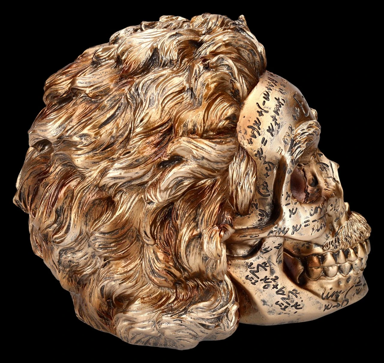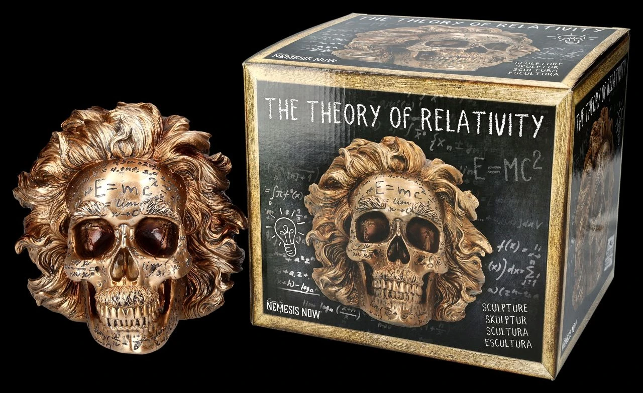 ‚Alles ist relativ‘ – gehört zu Einsteins berühmtesten Zitaten und bedeutet eigentlich, dass bestimmte Eigenschaften und physikalische Größen nur relativ zur Perspektive eines Beobachters definierbar oder auch messbar sind. Diese Erkenntnis ist der Grundpfeiler der Physik, die von Einstein zur Relativitätstheorie weiter entwickelt wurde. Dieser unglaubliche Totenkopf mit Einsteins wilder Haarpracht als Markenzeichen und mit der Relativitätstheorie-Formel auf der Stirn und im Gesicht wurde detailreich aus handbemaltem Kunststein (Polyresin) gefertigt. Für alle die wissen, dass alles zwar relativ aber damit nicht alles ‚egal‘ ist, ist dieser fantastische, 17,5 cm hohe, 18,5 cm breite und 20 cm tiefe Totenkopf von Nemesis Now ein super Geschenk und kommt inklusive einer Geschenkbox.