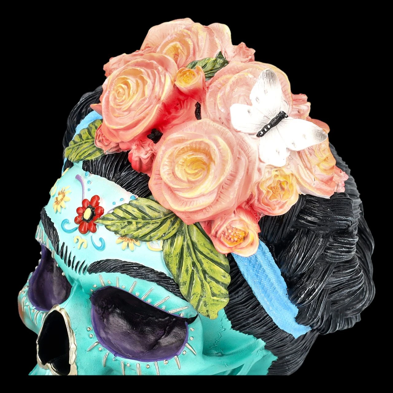 Der ‚Tag der Toten‘ wird in Mexiko mit ausgelassenen Festen gefeiert und bei diesen Festlichkeiten spielen Süßigkeiten, wie die bunten Zuckerschädel ‚Calavera de Azucar‘, eine große Rolle. Dieser blaue, mit mexikanischen Mustern verzierte Totenkopf aus wunderbar handbemaltem Kunststein (Polyresin) mit dem herrlichen Rosen-Stirnband ist von dieser Kultur inspiriert. Mit den extravaganten Augenbrauen erinnert er sogar etwas an die große Künstlerin Frida Kahlo. Für jeden, der den Dia de los Muertos feiert, ist dieser unglaublich fantastische, 18 cm hohe, 14 cm breite und 19 cm tiefe Totenkopf von Nemesis Now ein perfektes Geschenk und kommt inklusive einer tollen Geschenkbox
