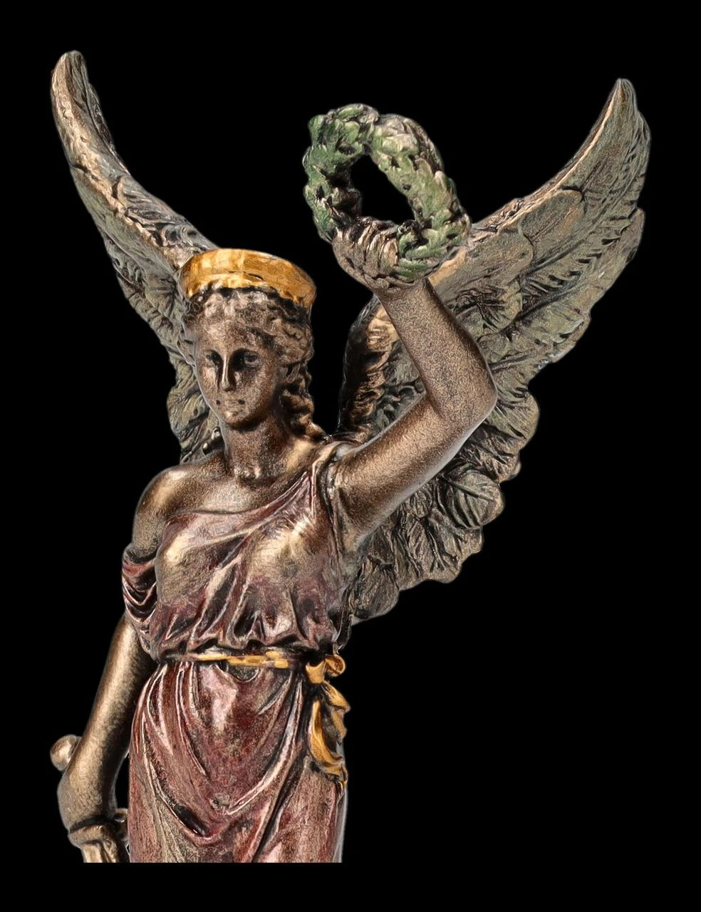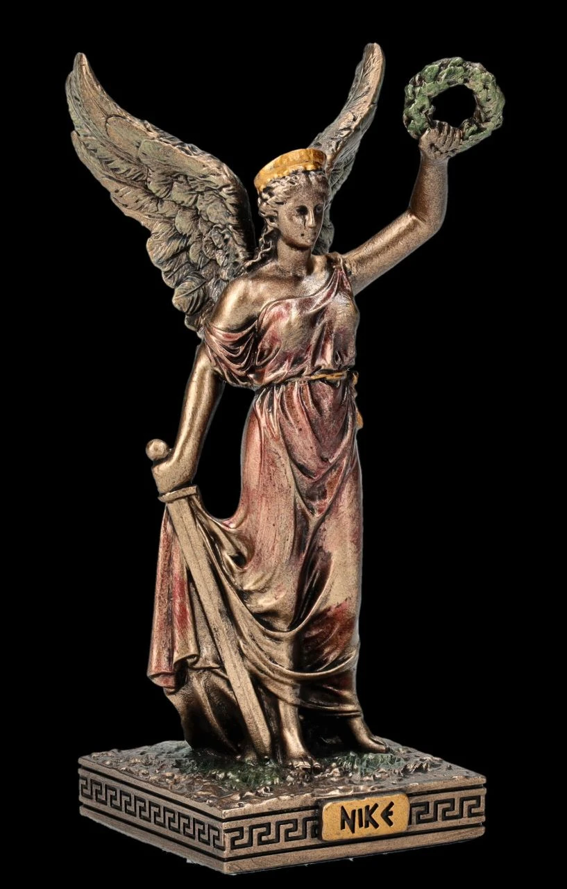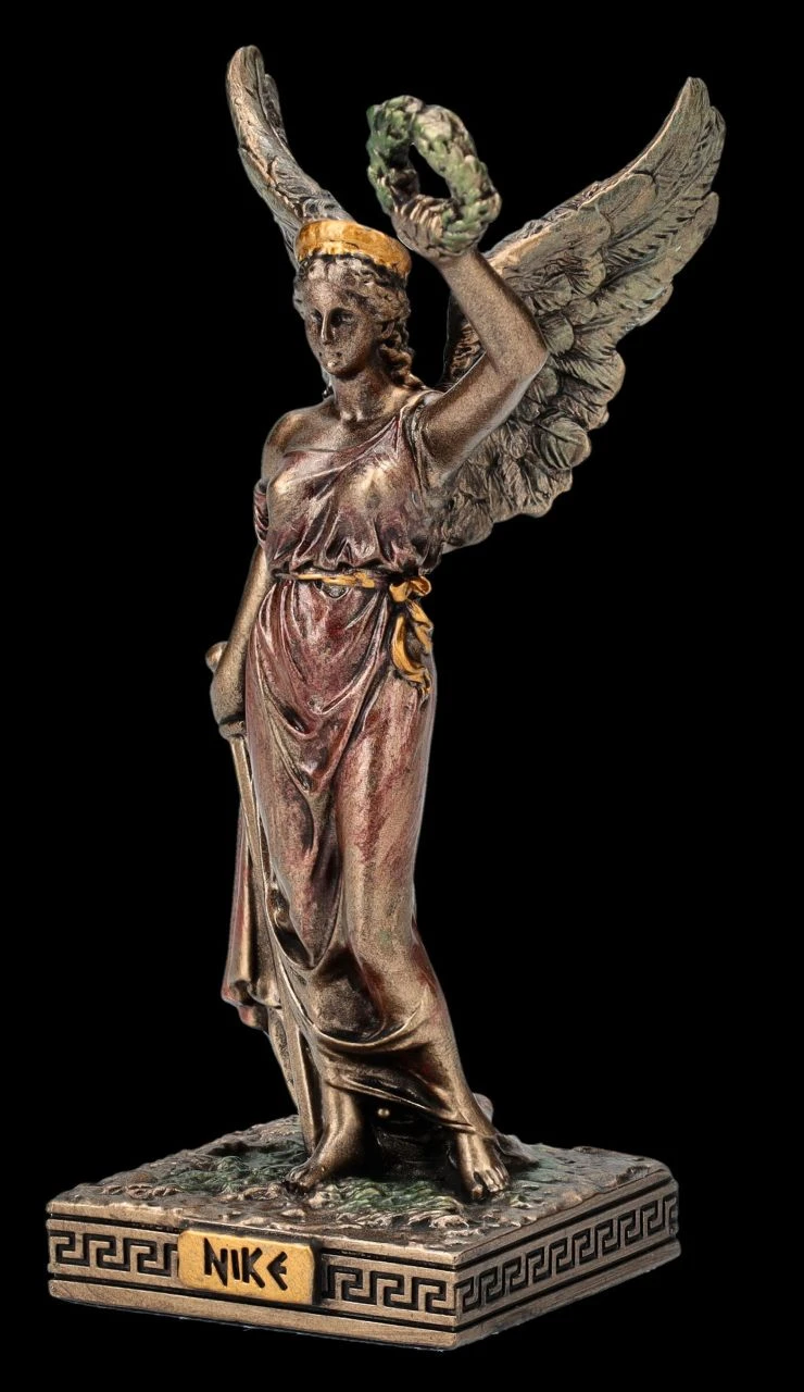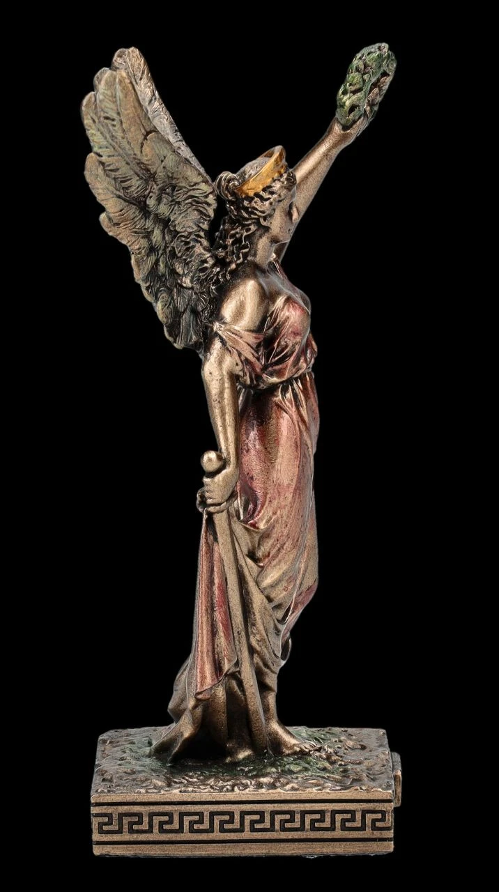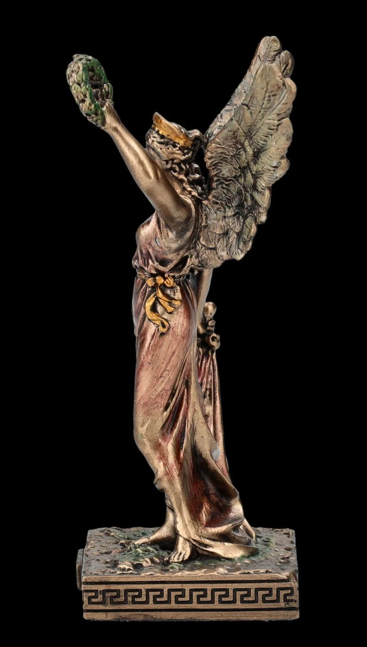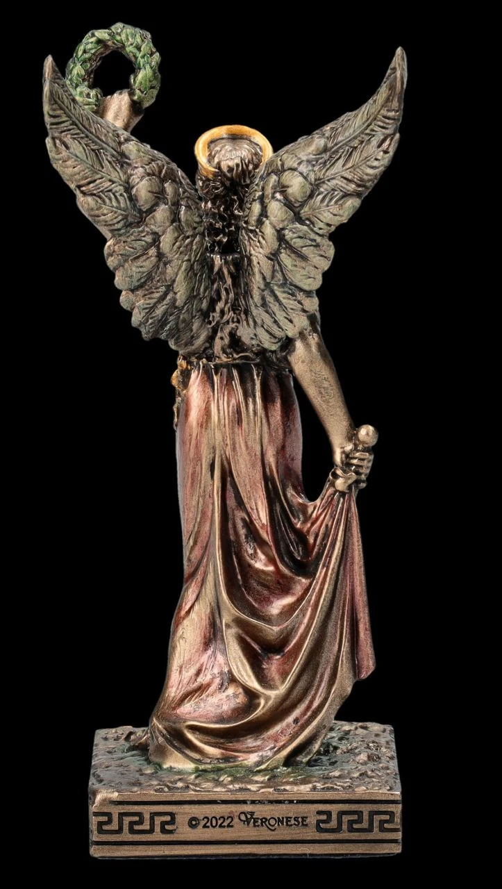 Aus dem Hause Veronese stammt diese wunderbare kleine Skulptur der Siegesgöttin Nike aus der altgriechischen Mythologie. In der einen Hand hält Nike das Schwert und mit der linken den Siegeskranz in die Höhe. Die kleine, aber wunderbar detailreich aus edel bronziertem und zurückhaltend coloriertem Kunststein (Polyresin) gefertigte Figur der Siegesgöttin Nike ist 10 cm hoch, 4,5 cm breit und 4 cm tief und für jeden, der vor einer Prüfung oder einem Kampf gegen die ‚Unwegsamkeiten des Lebens‘ steht, ein perfektes Geschenk.