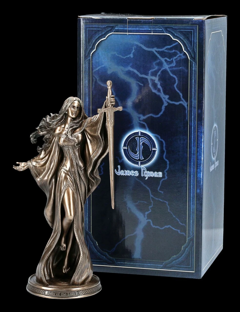 Über einer runden Scheibe, auf der, zwischen einer Bordüre mit dem keltischen Knotenmuster, ‚Lady of the Lake‘ zu lesen ist, schwebt die mythische Figur der Dame von Avalon. Sie hält das magische Schwert in die Höhe. Die langen Haare wehen, das hoch geschlitzte, lange Kleid mit den langen weiten Ärmeln wölbt sich im Wind und ihre nackten Füße schweben über dem Boden. Diese sehr dekorative und schöne Figur des berühmten Fantasy-Künstlers und Bildhauers James Ryman ist aus bronziertem Kunststein (Polyresin) hergestellt. ‚Lady of the Lake‘ ist 26,0 cm hoch, 12,0 cm breit und 11,0 cm tief. Es ist auch ein wunderbares Geschenk für Liebhaber der Artus-Legende.