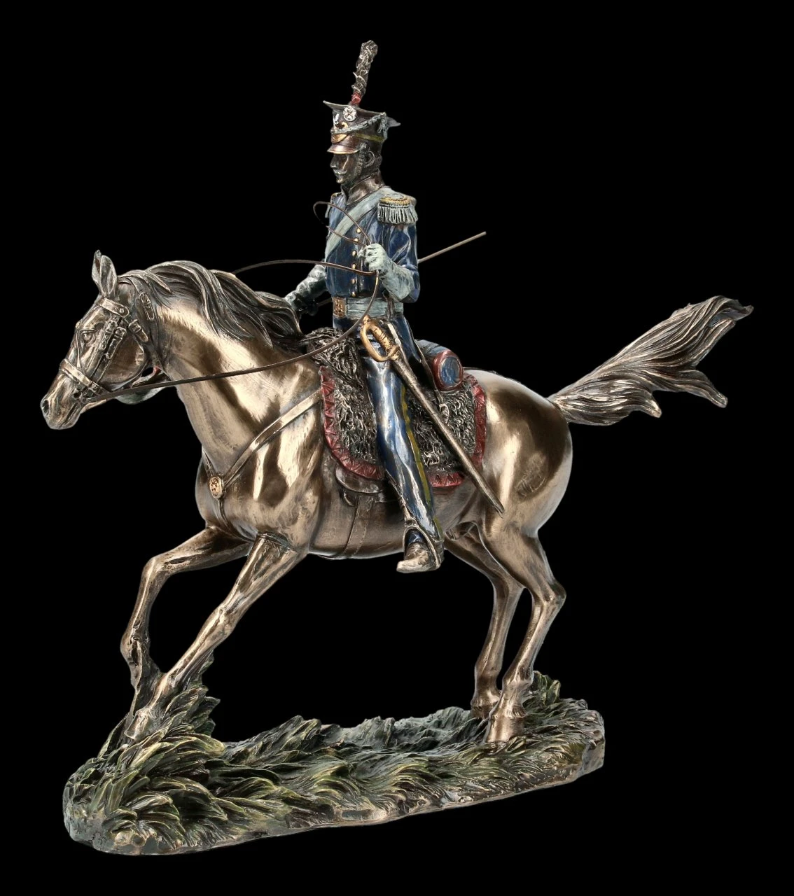 Ulanen sind eine mit Lanzen bewaffnete Gattung der polnischen Kavallerie. Diese detailgetreue Darstellung eines solchen Reiters von Veronese aus der Serie Studio Collection aus bronziertem Kunststein wurde liebevoll coloriert. Der Reiter trägt die charakteristische Uniform inkl. der viereckigen Kopfbedeckung.