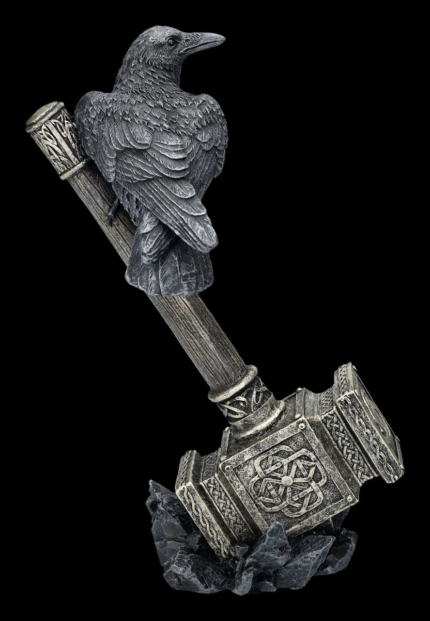 Ein Rabe hat sich auf Thors Hammer Mjölnir niedergelassen und scheint darauf zu warten, dass Thor persönlich kommt, um den Hammer an sich zu nehmen. Schließlich ist nur Thor so stark, den magischen Hammer aufzuheben. Mit diesem Kriegshammer soll er als der stärkste aller Götter deren Feinde und vor allem auch die Midgardschlange bekämpfen. Dieser 23 cm hohe, 15,5 cm breite und 9 cm tiefe Hammer mit dem Raben wurde sorgfältig und detailreich aus handbemaltem Kunststein (Polyresin) gefertigt. Er ist eine prächtige Deko und darf bei keinem Wikinger fehlen. Für jeden echten Wikinger ist Thors Hammer mit dem Raben aber auch ein fantastisches Geschenk.