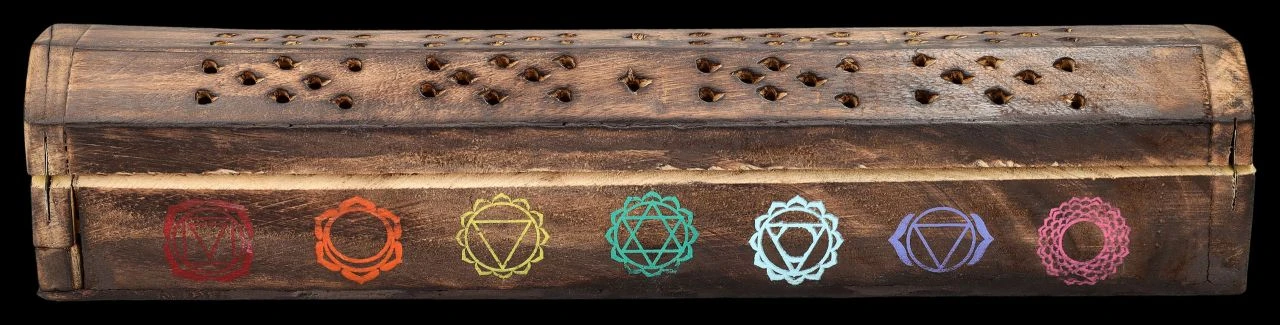 Chakra-Symbole in den Chakra-Farben machen aus der handbemalten Holzbox etwas Besonderes. Sie dient als perfekte Aufbewahrung für die 10 Räucherstäbchen mit der Duftnote: Erdbeere, Orange, Zitrone, Minze, Heidelbeere, Lavendel und Brombeere, die bei dieser schönen Holzbox mit dabei sind. Die Holzbox kann an der Seite geöffnet werden, so dass der Vorrat der Räucherstäbchen im Boden untergebracht werden kann. Klappt man den Deckel der 6,5 cm hohen, 31 cm breiten und 6 cm tiefen Holzbox auf, kann man, je nach Wunsch, auch Räucherkegel in der Box abstellen. Die Räucherkegel sind nicht inklusive, aber hier findet man – wie auch bei den Räucherstäbchen – eine große Auswahl in unserem Shop.