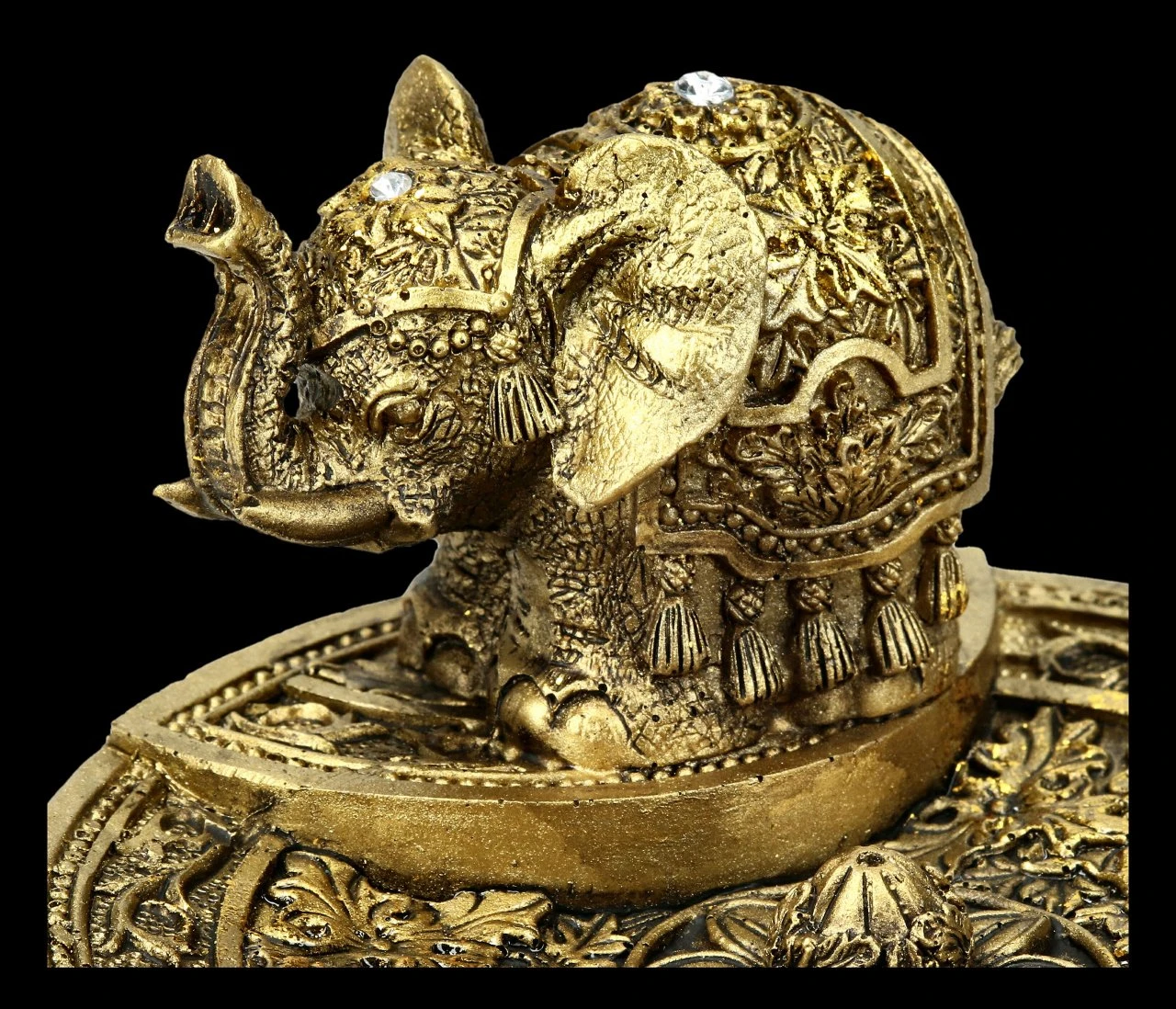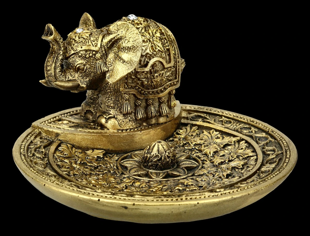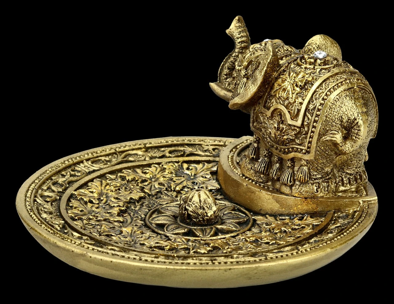 Ein edles Wohnaccessoire ist dieser goldfarbene und mit Schmucksteinen verzierte Räucherstächenhalter mit dem indischen Elefanten. Mit einem Durchmesser von 11 cm und einer Höhe von 5,5 cm gibt der sehr detailreich aus Kunststein (Polyresin) gefertigte und edel handbemalte Räucherstäbchenhalter Ihrem Wohn- oder Arbeitsraum einen asiatischen Touch. Die Lieferung erfolgt ohne Räucherstäbchen. Räucherstäbchen finden Sie in großer Auswahl in unserem Shop.