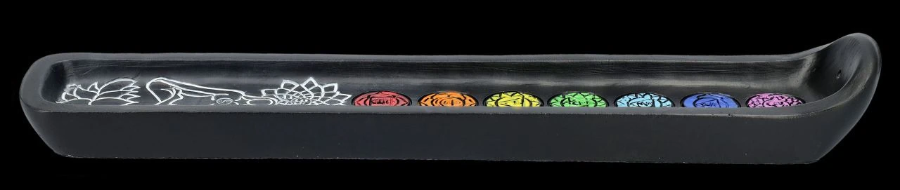 Neben den sieben farbigen Chakrapunkten ist in der Schale des schönen Räucherstäbchenhalters auch eine Lotusblüte und die Blume des Lebens zu sehen. Der schöne Räucherstäbchenhalter aus handbemaltem Kunststein (Polyresin) ist der perfekte ‚Duftspender‘ in einem Yogastudio und natürlich auch in jedem privaten Rückzugsraum und wirkt sehr elegant. Er ist 3 cm hoch, 25,5 cm breit und 4,5 cm tief. Die Lieferung erfolgt ohne Räucherstäbchen, die jedoch in zahlreichen Duftrichtungen in unserem Shop zu finden sind.