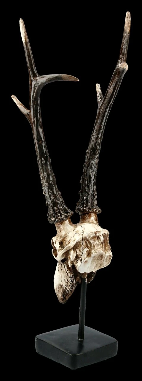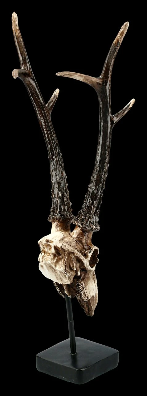 Ob im Wohnbereich oder in Ihrem Arbeitsbereich, dieser ungewöhnlich dekorative Totenkopf eines Rehbocks mit den langen Hörnern wird überall mit Sicherheit alle Blicke auf sich ziehen. Der schön geformte Rehbock-Schädel ist sehr aufwändig und detailreich aus Kunststein (Polyresin) gefertigt und mit großer Sorgfalt handbemalt. Der Schädel ist auf einem Metallständer befestigt und wirkt durch seine elegante, schmale Silhouette beeindruckend effektvoll. Mit seiner Gesamthöhe von 51 cm, wobei der Schädel eine Höhe von 44 cm hat, der Breite von 20 cm und der Tiefe von 11 cm ist dieser Rehbock-Schädel mit den langen Hörnern eine wirklich außergewöhnliche Dekoration.