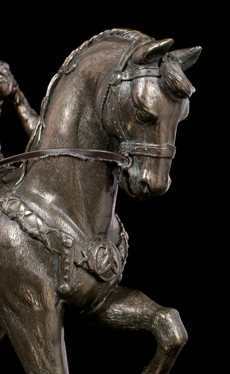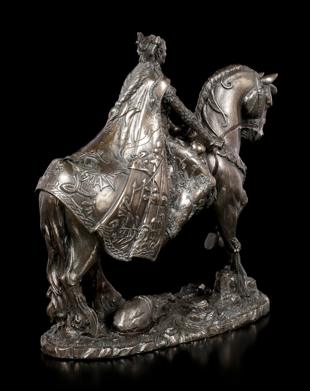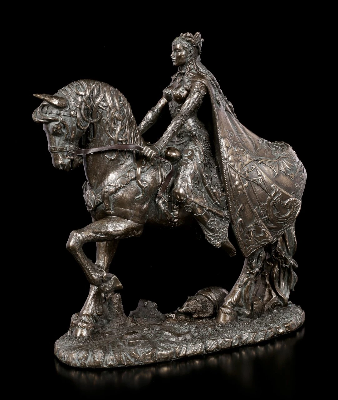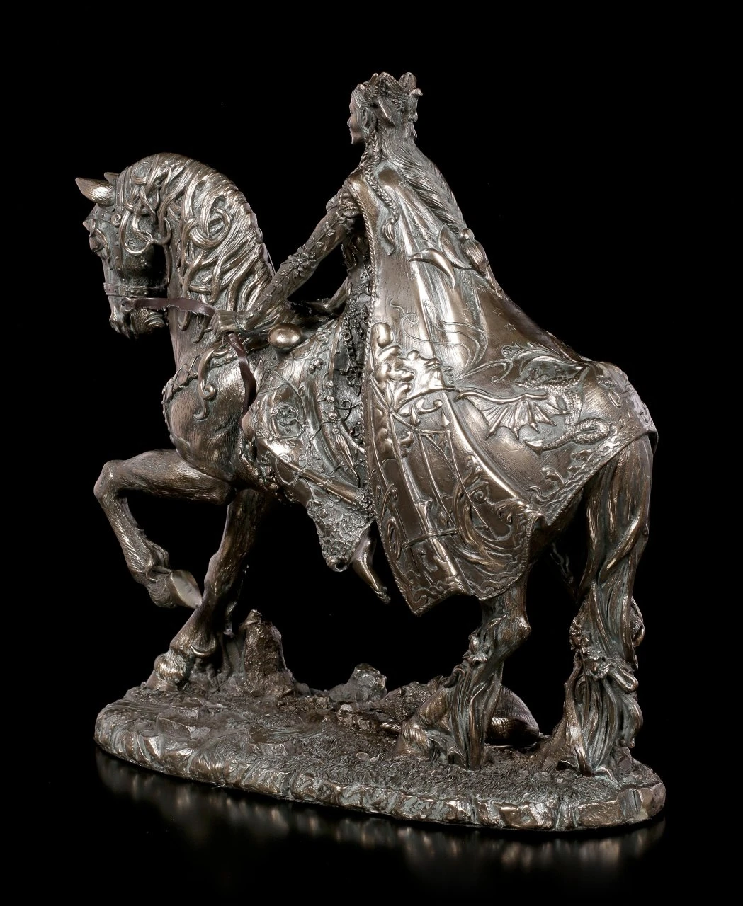 Aus der walisischen, keltischen Mythologie stammt Rhiannon. Viel ist über die mystische Dame nicht bekannt. Es wird vermutet, dass sie als Pferdegöttin galt. Sie erscheint in mittelalterlichen Geschichten als Naturgeist und wunderschöne menschliche Elfe mit außergewöhnlichen Fähigkeiten, die auf ihrem weißen Pferd schnell wie der Wind über die Erde sauste. Diese umwerfende Darstellung der keltischen Göttin auf ihrem herrlichen Pferd wurde aus edel bronziertem Kunststein (Polyresin) gefertigt. Die prächtige Figur der Göttin Rhiannon wurde von der vielseitigen Künstlerin Maxine Miller geschaffen und hat zahlreiche wundervolle Details. Nicht nur wer von der keltischen Mythologie fasziniert ist, wird sich über diese schöne Rhiannon Figur als Geschenk.sehr freuen.