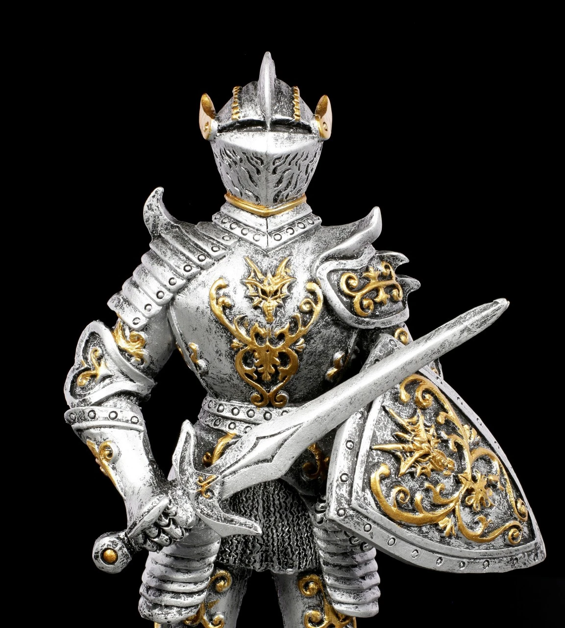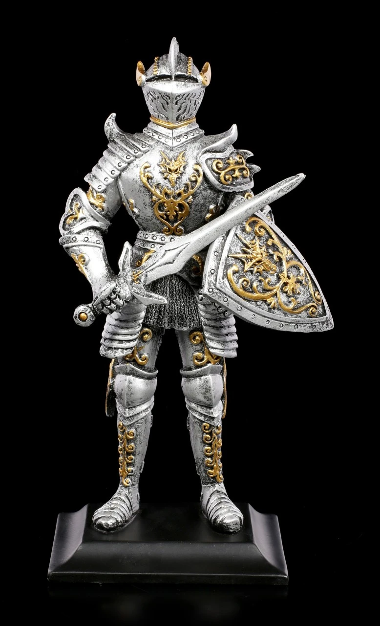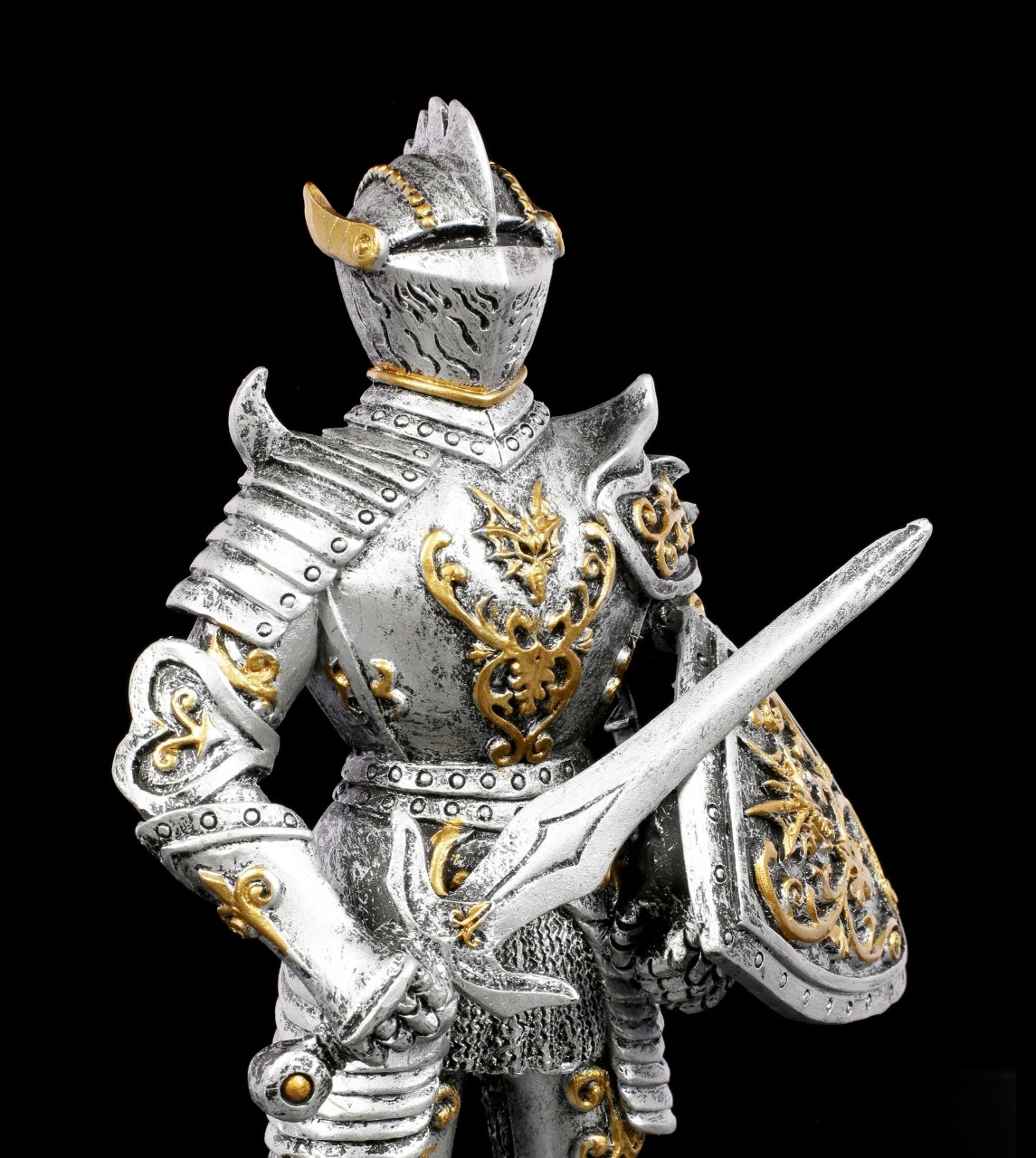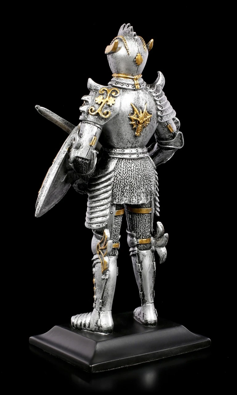 Die detailreiche Ritter Rüstung aus Kunststein (Polyresin) wurde handbemalt und wird Sie als Mittelalterfan begeistern. Die reich verzierte Ritter Rüstung auf schwarzem Sockel ist eine wunderbare Ergänzung zu jeder mittelalterlichen Sammlung. Das Schild des Ritters ziert ein Drachenkopf.