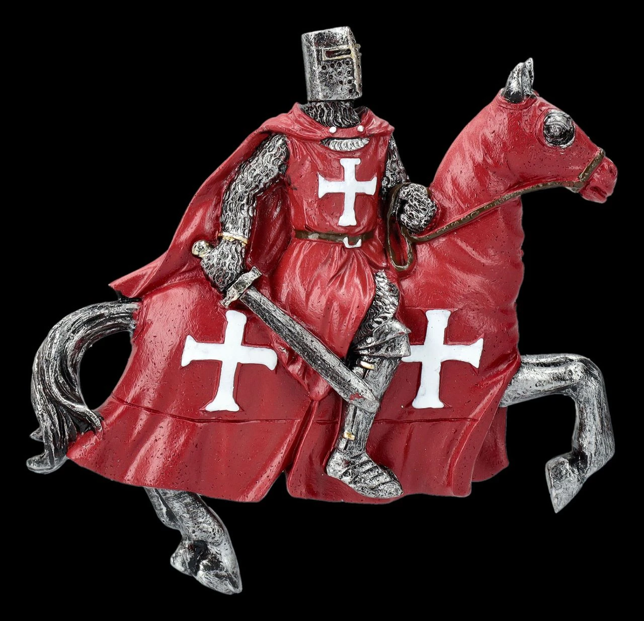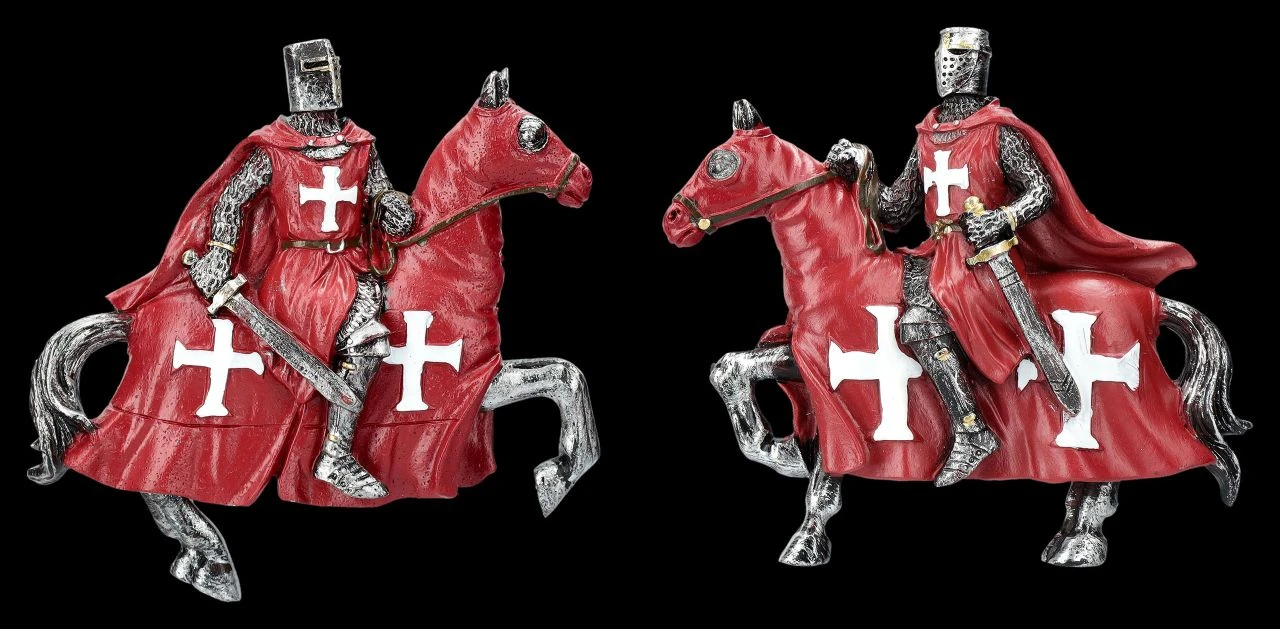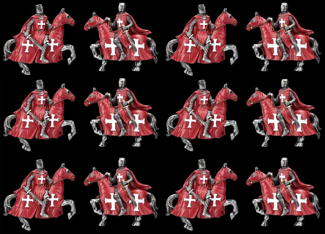 Dieses herrliche 12er Set Magnete mit Kreuzrittern auf ihren Pferden sind ein perfektes Geschenk und fantastisch dazu geeignet, mit Ritter-Freunden geteilt zu werden. Die Kreuzritter aus handbemaltem Kunststein (Polyresin) bestehen aus 2 x 6 Rittern mit unterschiedlichen Schwertern. Mit den weißen Kreuzen auf ihren leuchtend roten Umhängen und den ebenfalls roten Decken der Pferde mit weißen Kreuzen sind die Ritter-Magnete nicht nur sehr dekorativ, sondern auch sehr praktisch. Die Ritter sind jeweils 8 cm hoch, 9 cm breit und 1,5 cm tief.