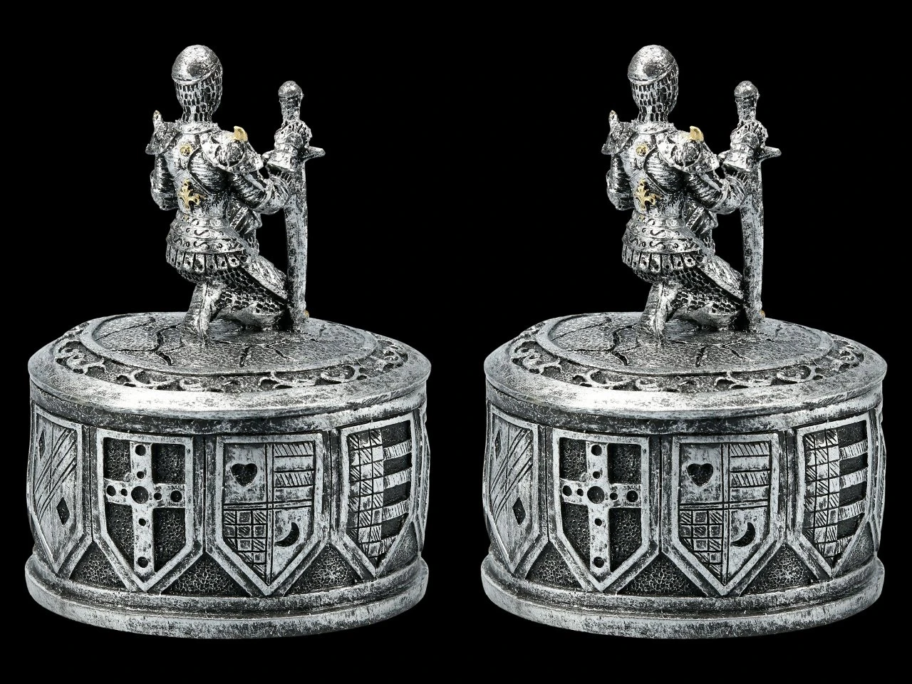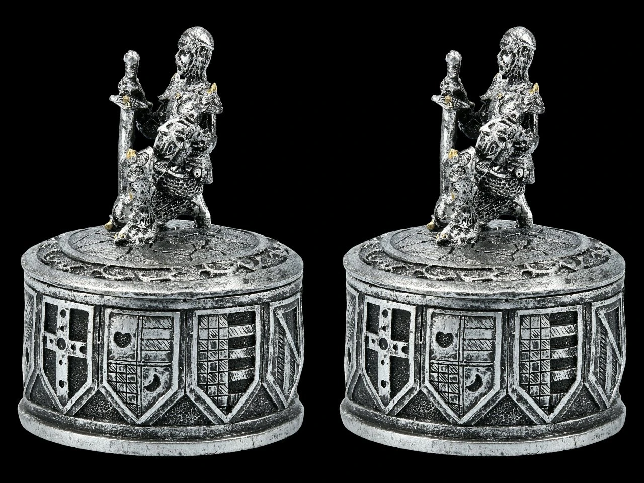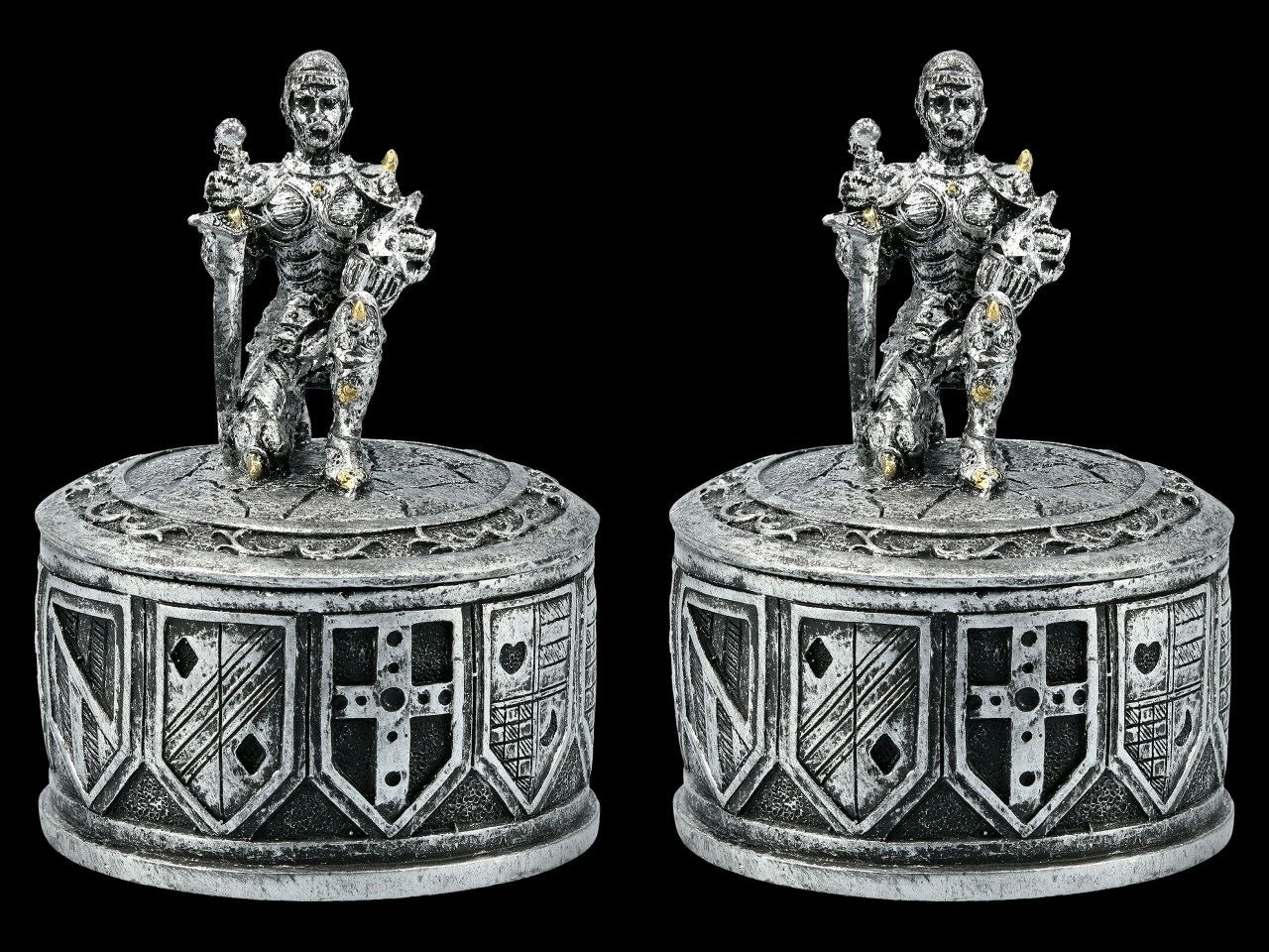Sie möchten sich mit Ihrem Ritter ein Geheimnis teilen – diese tolle Ritter Schatulle im 2er Set ist dazu perfekt geeignet. Die beiden Schatullen aus Kunststein (Polyresin) sind detailreich gearbeitet und edel silberfarben handbemalt. Jede der beiden Schatullen hat eine Höhe von 10,5 cm, wobei der Ritter 5,5 cm groß ist. Die Breite und die Tiefe der Schatullen ist jeweils 7 cm und die Innenmaße sind H 3,5 cm / D 6,5 cm und bieten auch Platz z.B. für ein besonderes Schmuckgeschenk.